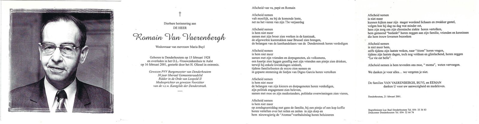 | Van Vaerenbergh Romain, Burgemeester Denderhoutem | Denderhoutem | 15/02/1928 | Aalst | 16/02/2001 |