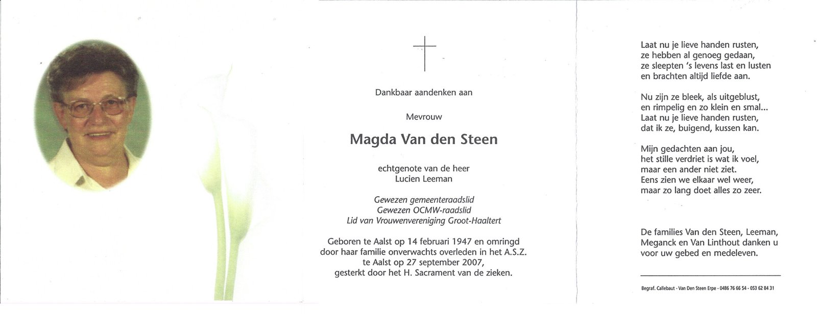 | Van den Steen Magda, Gemeenteraadslid Haaltert | Aalst | 14/02/1947 | Aalst | 27/09/2007 |