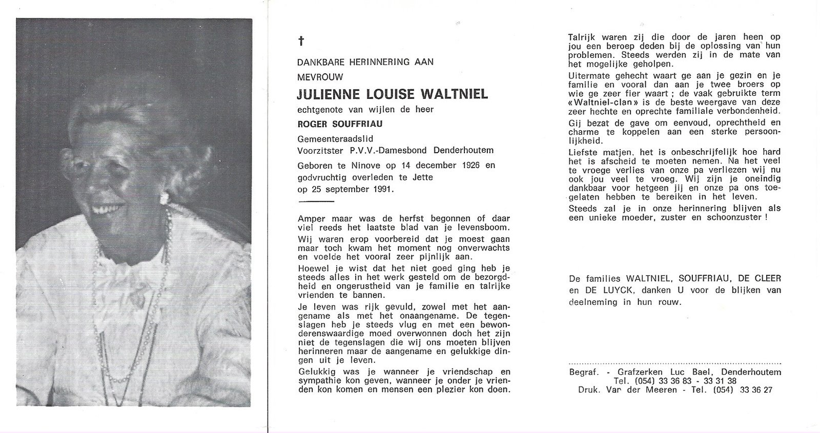 | Waltniel Julienne, Gemeenteraadslid Denderhoutem | Ninove | 14/12/1926 | Jette | 25/09/1991 |