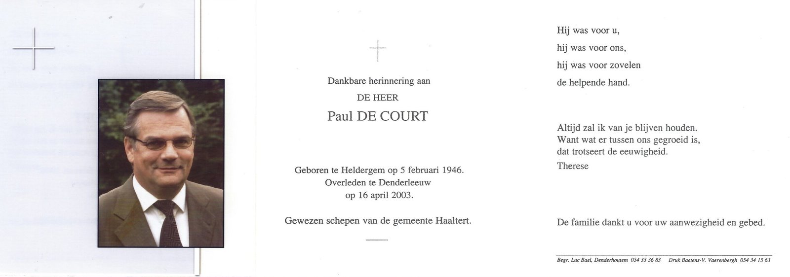 | De Court Paul | Heldergem | 05/02/1946 | Denderleeuw | 16/04/2003 |