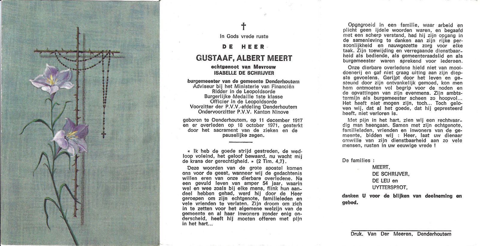 | Meert Gustaaf Albert, Burgemeester Denderhoutem | Denderhoutem | 11/12/1917 | Denderhoutem | 18/10/1971 |