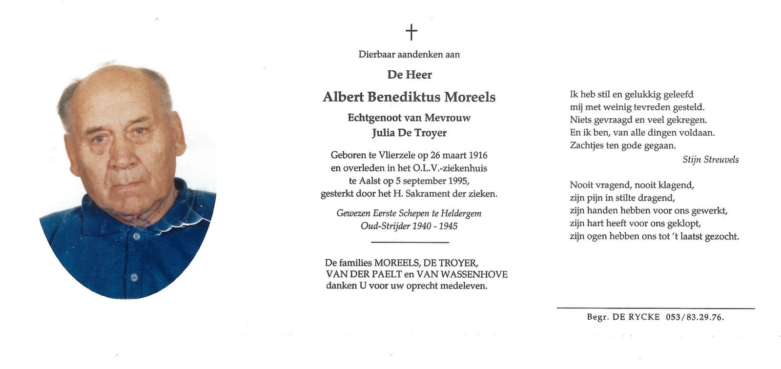 | Moreels Albert Benediktus | Vlierzele | 26/03/1916 | Aalst | 05/09/1995 |