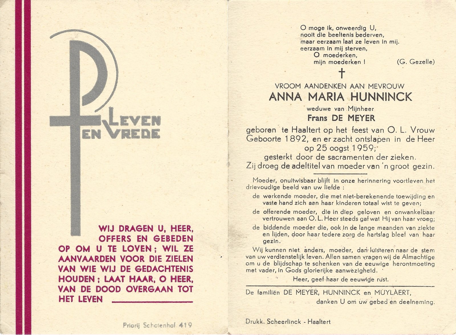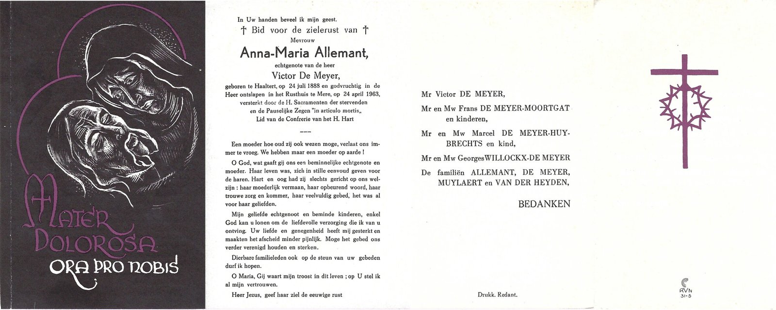 | Allemant Anna-Maria | De Meyer Victor | Haaltert | 24/07/1888 | Mere | 24/04/1963 |