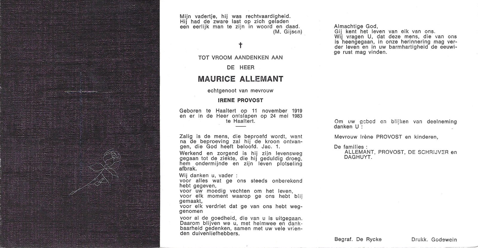 | Allemant Maurice | Provost Irene | Haaltert | 11/11/1919 | Haaltert | 24/05/1983 |