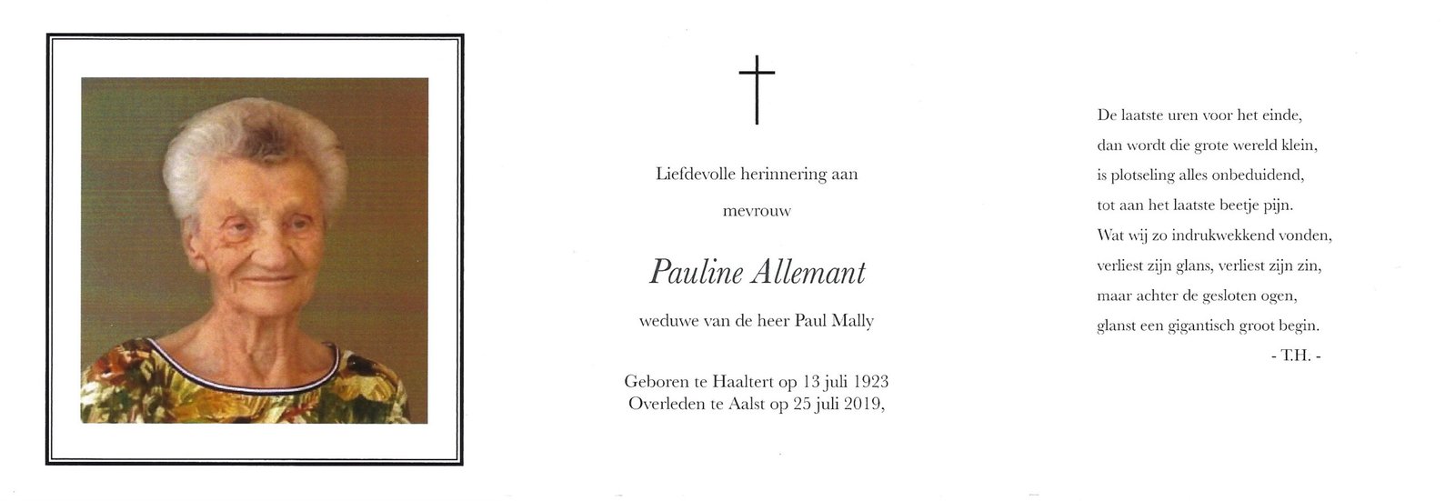 | Allemant Pauline | Mally Paul | Haaltert | 13/07/1923 | Aalst | 25/07/2019 |