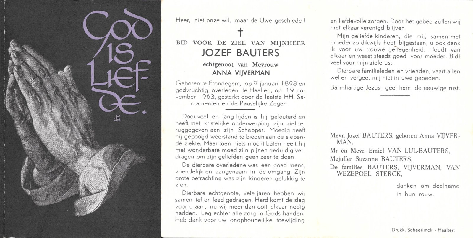 | Bauters Jozef | Vijverman Anna | Erondegem | 09/01/1898 | Haaltert | 19/11/1963 |