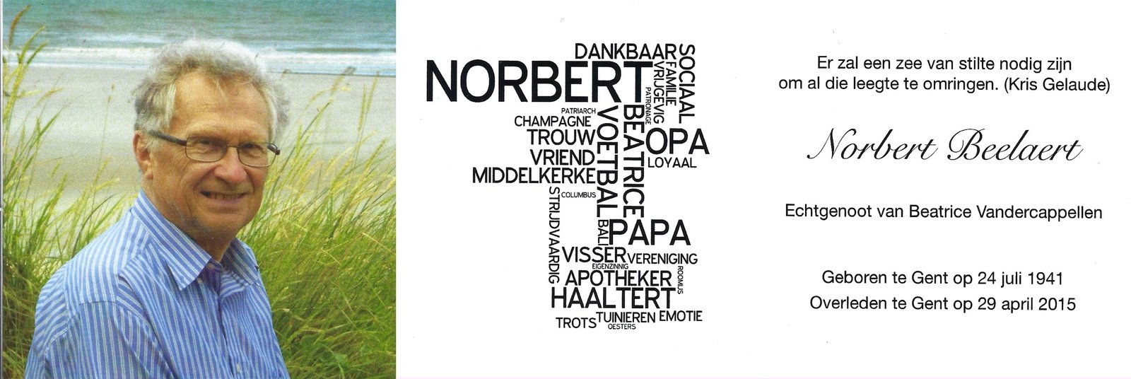 | Beelaert Norbert | Vandercappellen Beatrice | Gent | 24/07/1941 | Gent | 29/04/2015 |