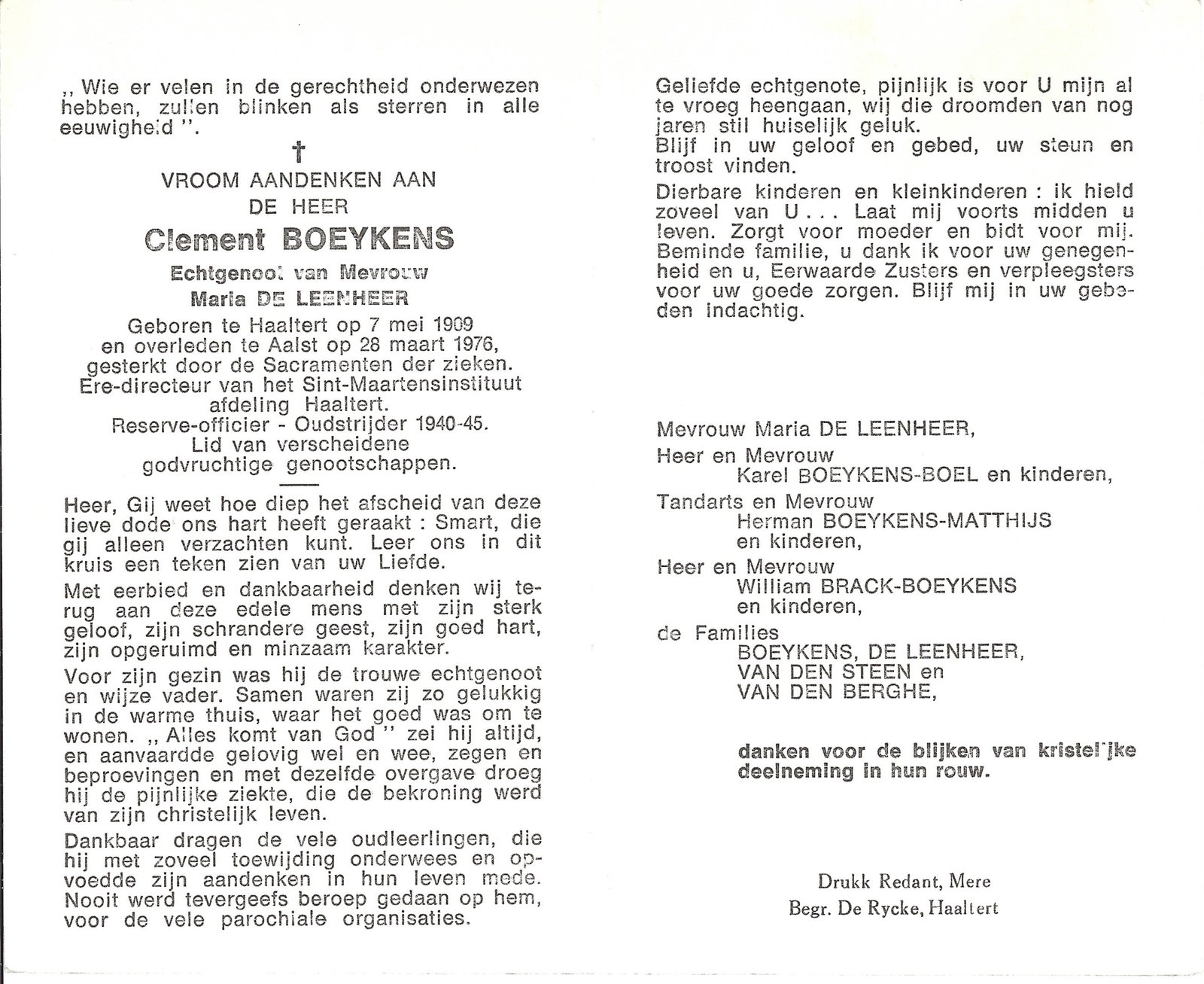 | Boeykens Clement | De Leenheer Maria | Haaltert | 07/05/1909 | Aalst | 28/03/1976 |
