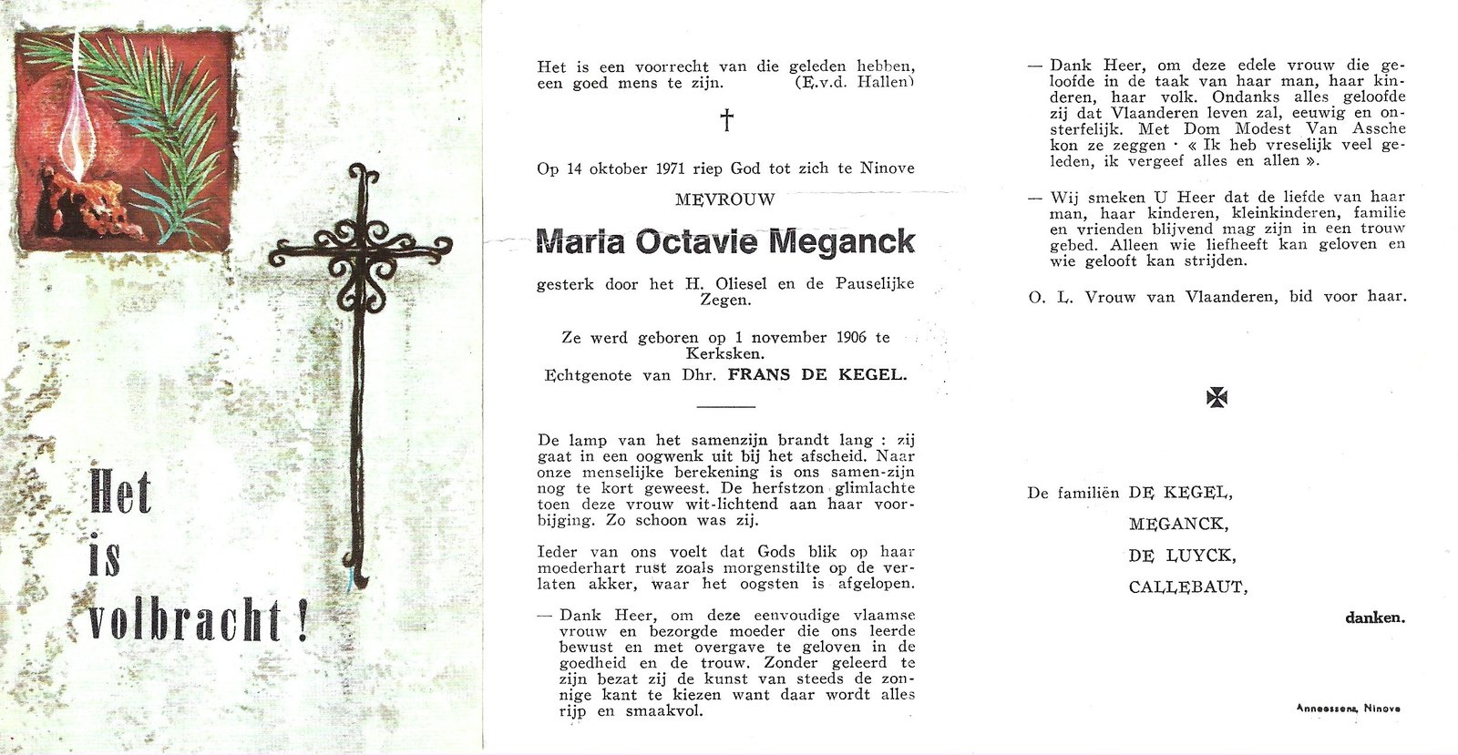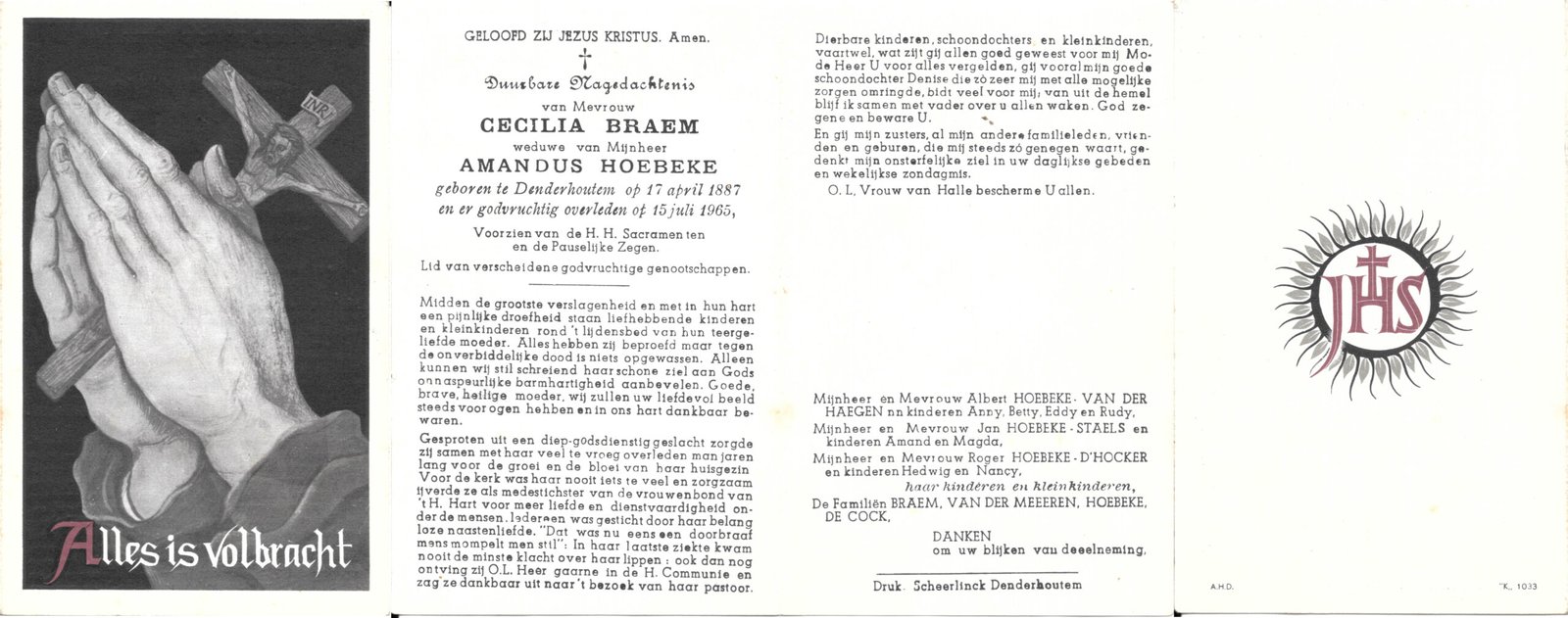 | Braem Cecilia | Hoebeke Amandus | Denderhoutem | 17/04/1887 | Denderhoutem | 15/07/1965 |