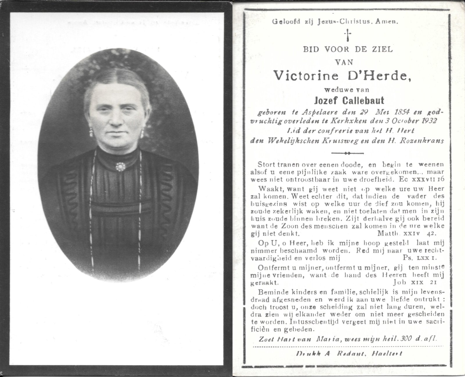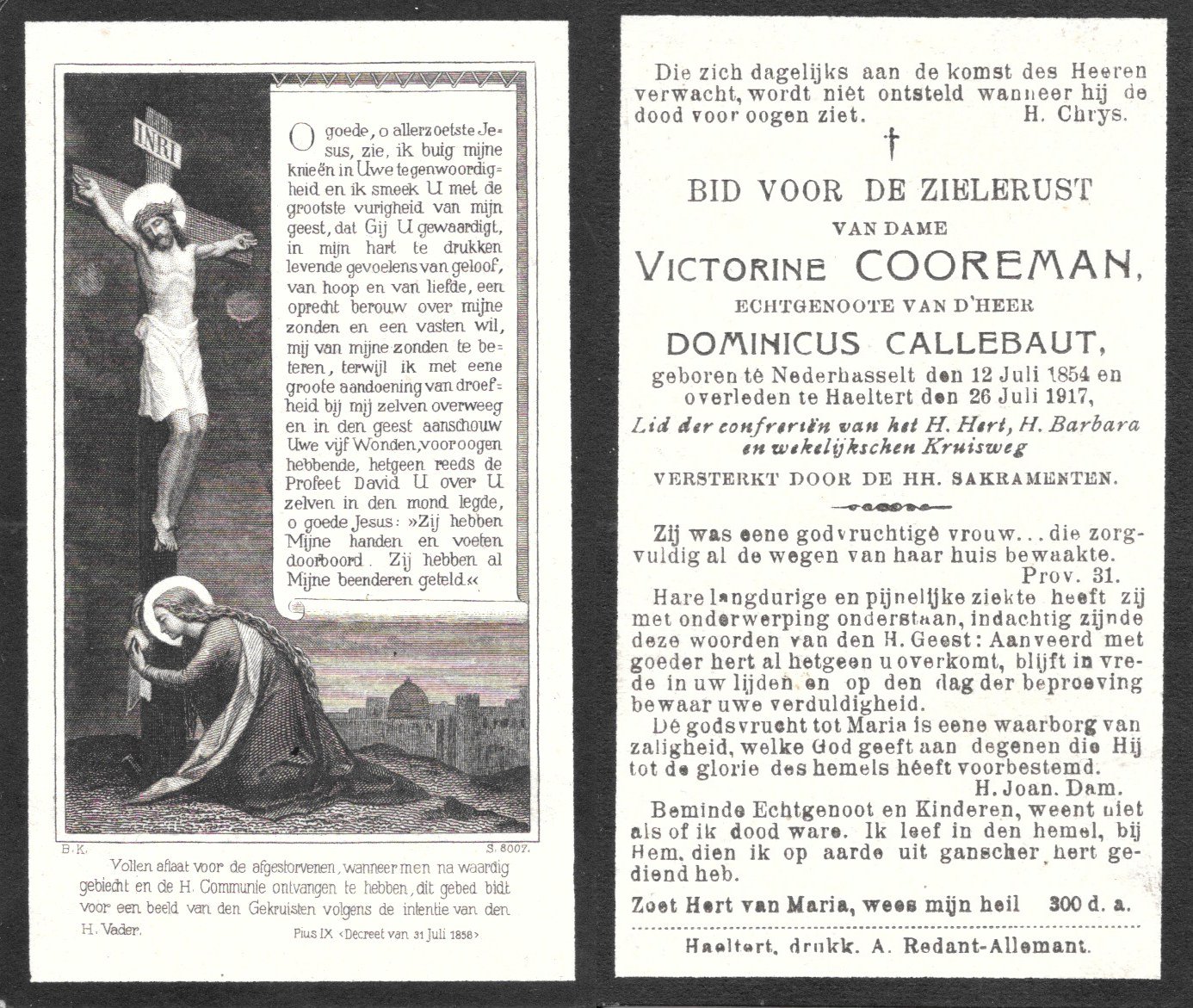 | Cooreman Victorine | Callebaut Dominicus | Nederhasselt | 12/07/1854 | Haaltert | 26/07/1917 |