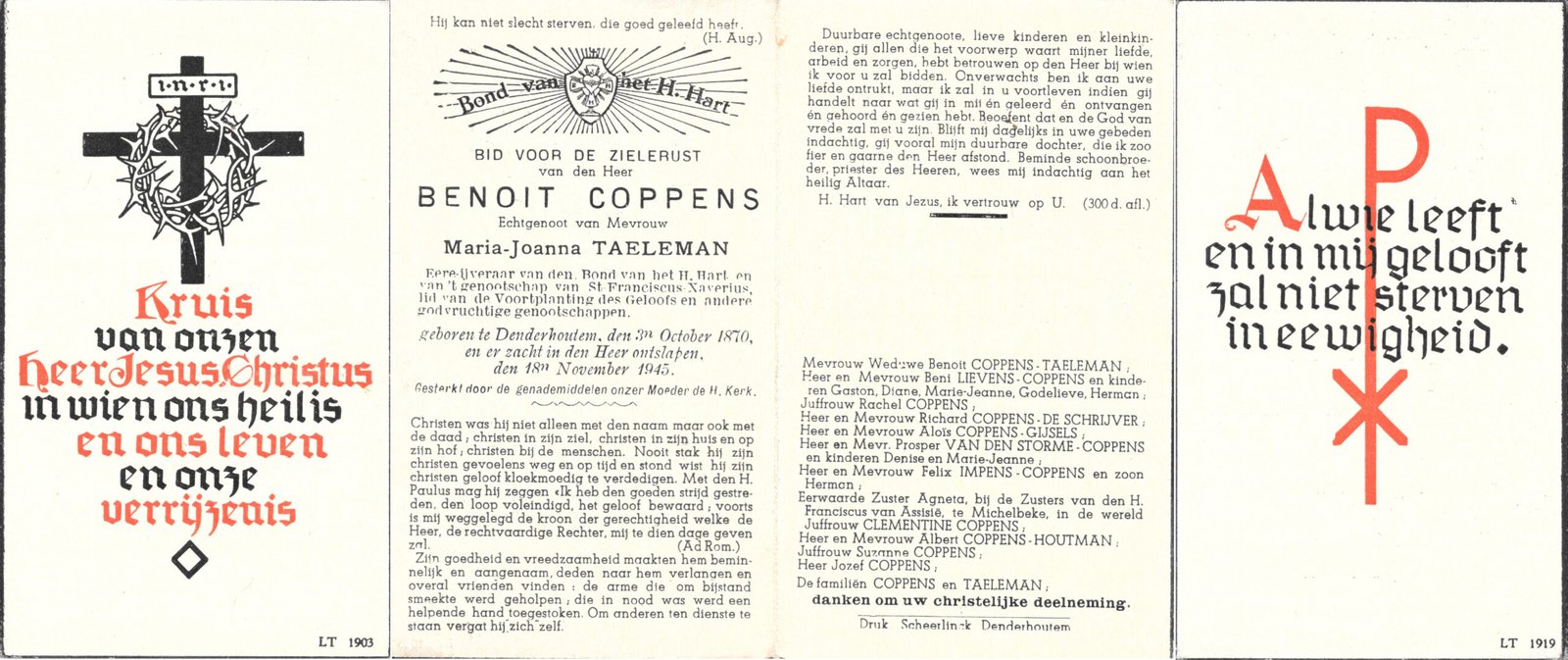 | Coppens Benoit | Taeleman Maria-Joanna | Denderhoutem | 03/10/1870 | Denderhoutem | 18/11/1945 |