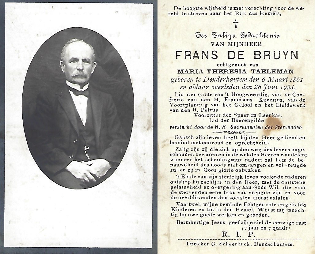 | De Bruyn Frans | Taeleman Maria Thérèsia | Denderhoutem | 06/03/1861 | Denderhoutem | 26/06/1933 |