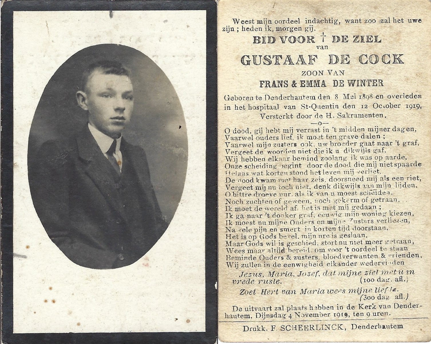 | De Cock Gustaaf | Denderhoutem | 08/05/1898 | Saint-Quintin (Fr) | 12/10/1919 | |
