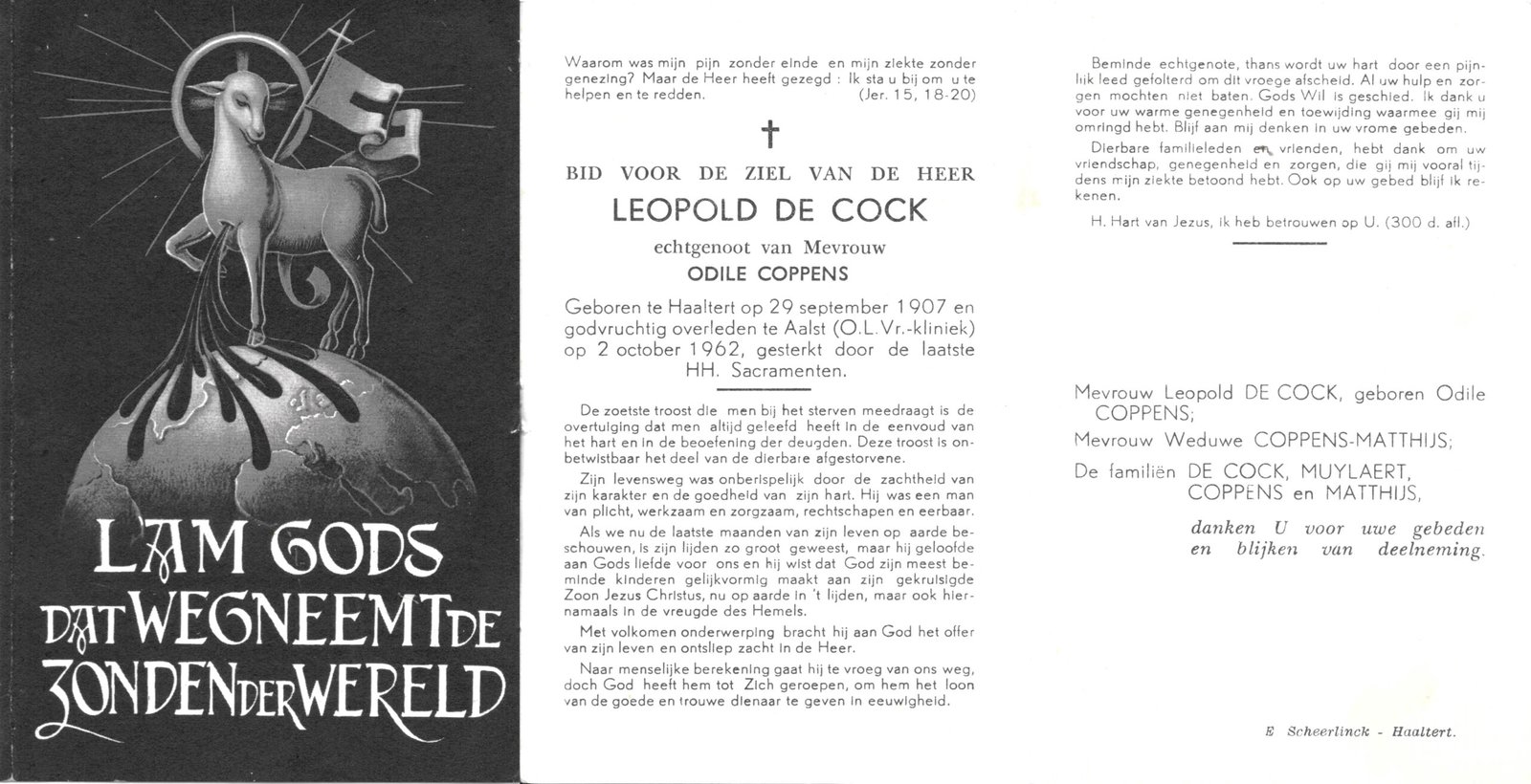 | De Cock Leopold | Coppens Odile | Haaltert | 29/09/1907 | Aalst | 02/10/1962 |