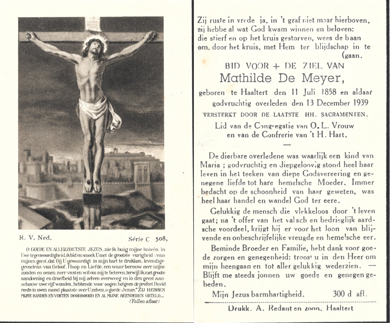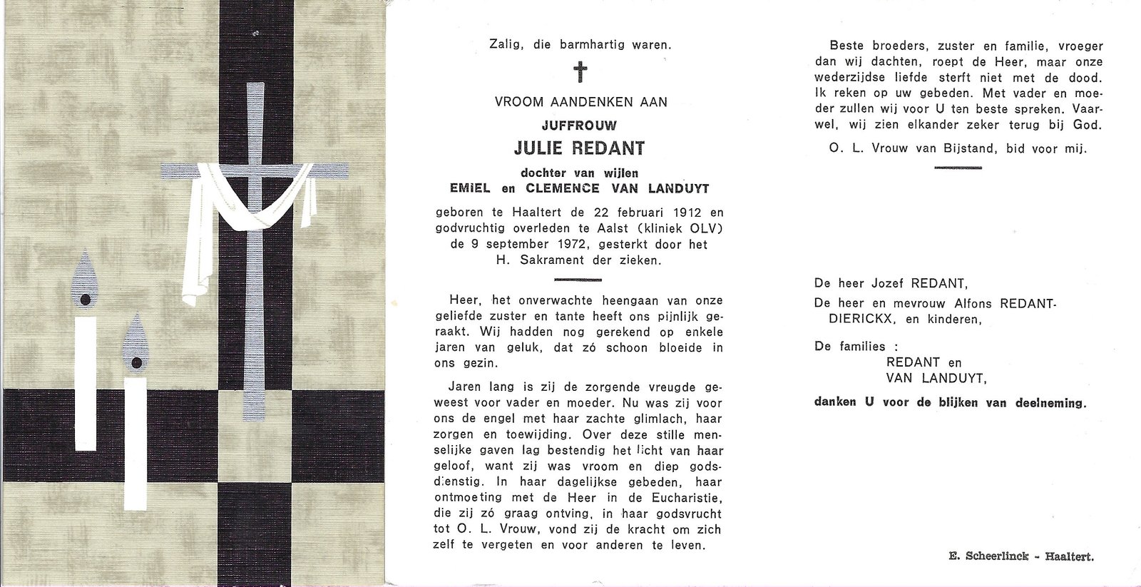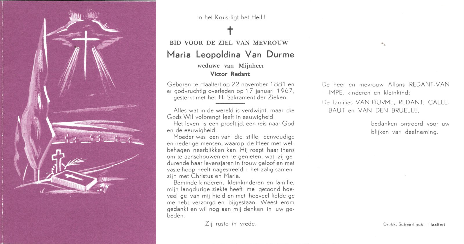 | Van Durme Maria Leopoldina | Redant Victor | Haaltert | 22/11/1881 | Haaltert | 17/01/1967 |