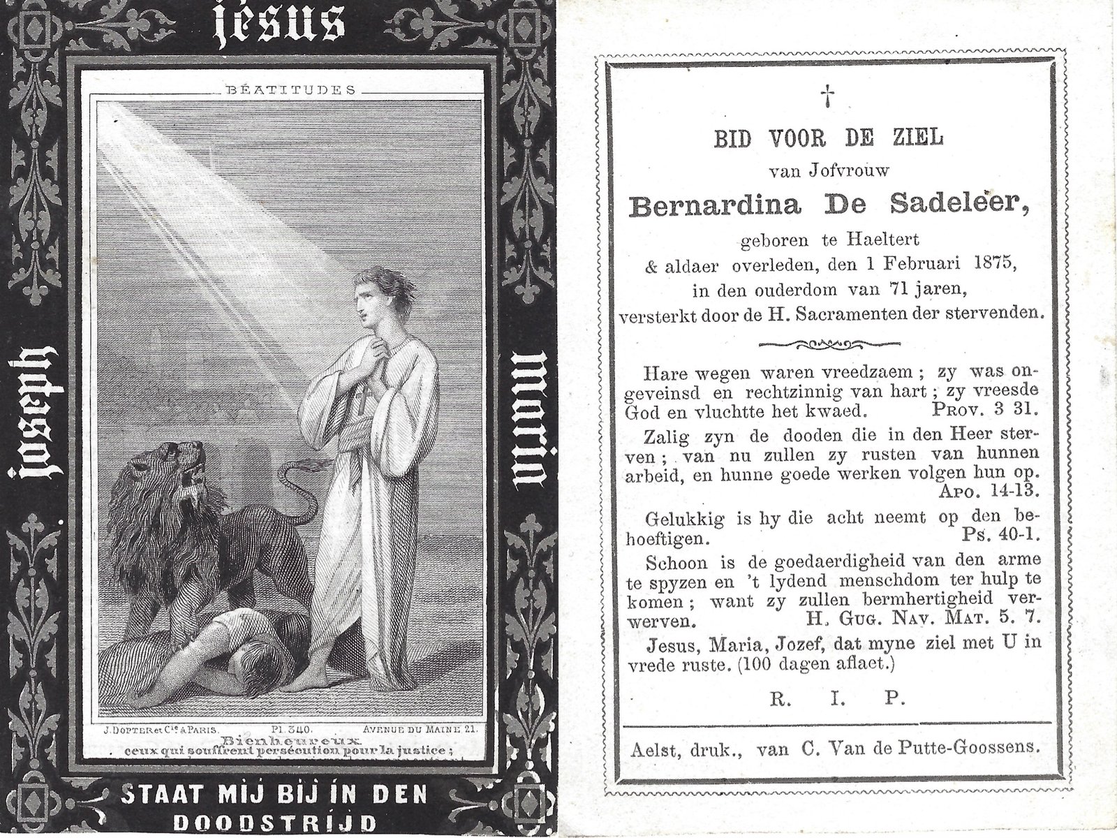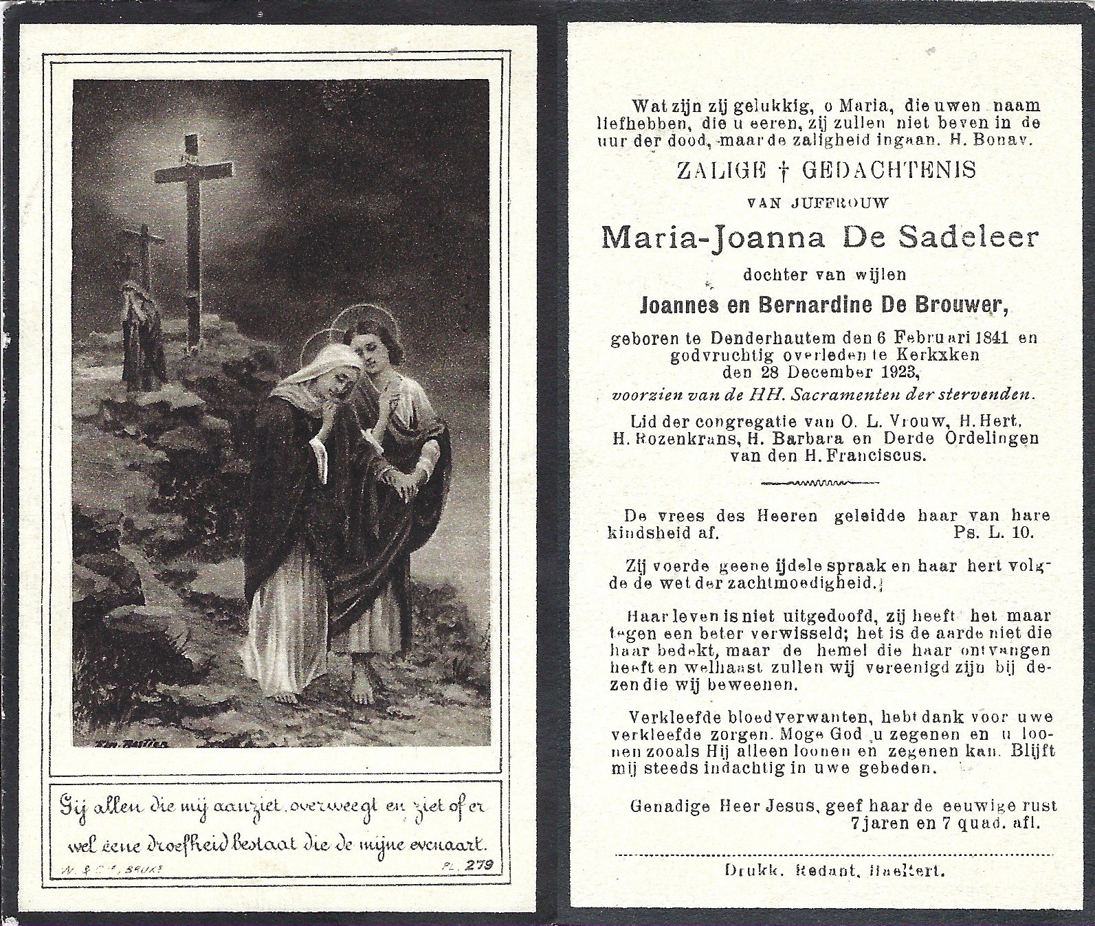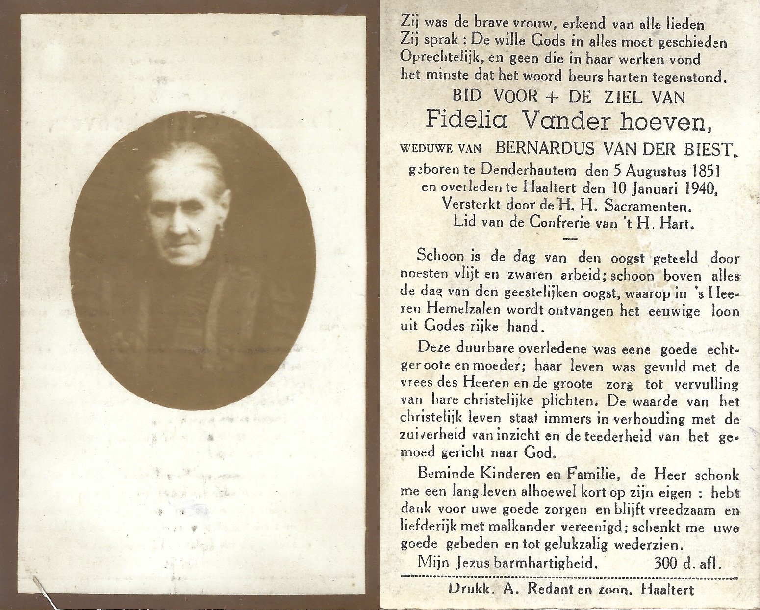 | Vander hoeven Fidelia | Van Der Biest Bernardus | Denderhoutem | 05/08/1851 | Haaltert | 10/01/1940 |