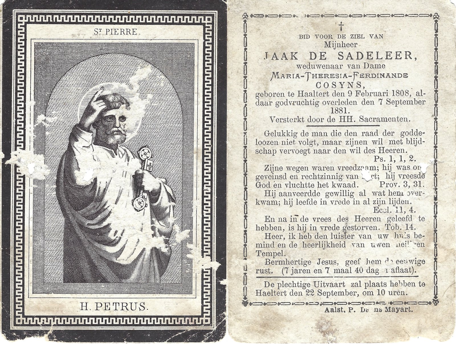 | Cosyns Maria-Thérèsia | De Sadeleer Jacobus | Meerbeke | 11/07/1820 | Haaltert | 27/08/1876 |