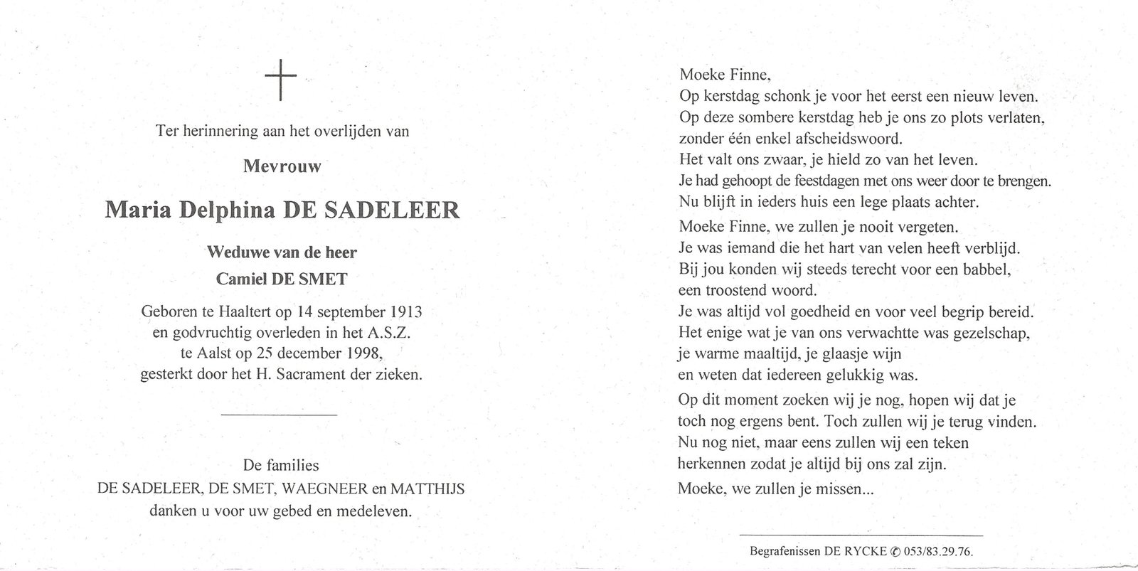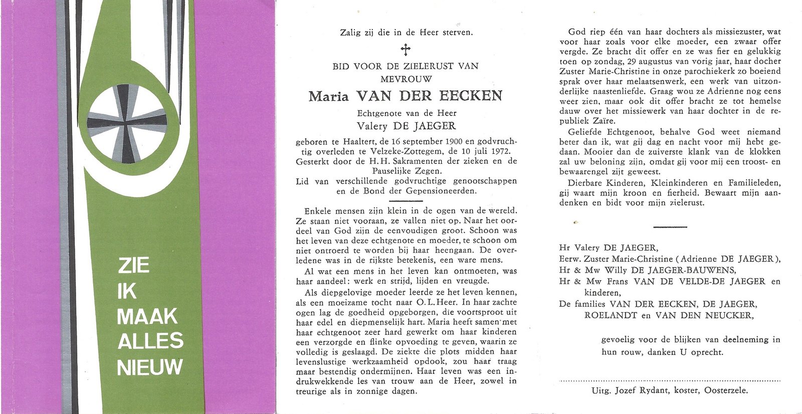 | Van der Eecken Maria | De Jaeger Valerie | Haaltert | 16/09/1900 | Velzeke | 10/07/1972 |
