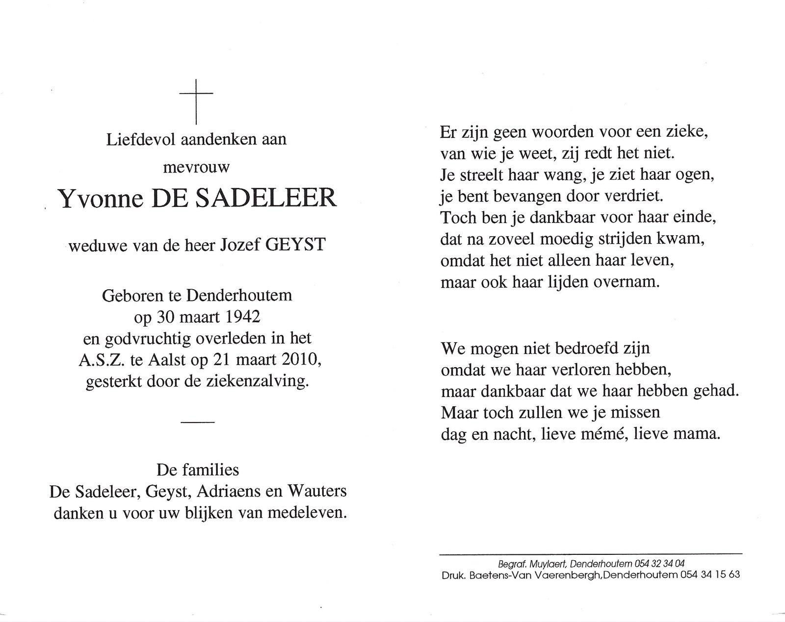 | Baeyens Etienne | Van Impe Maria | Mere | 05/02/1938 | Aalst | 14/09/1994 |