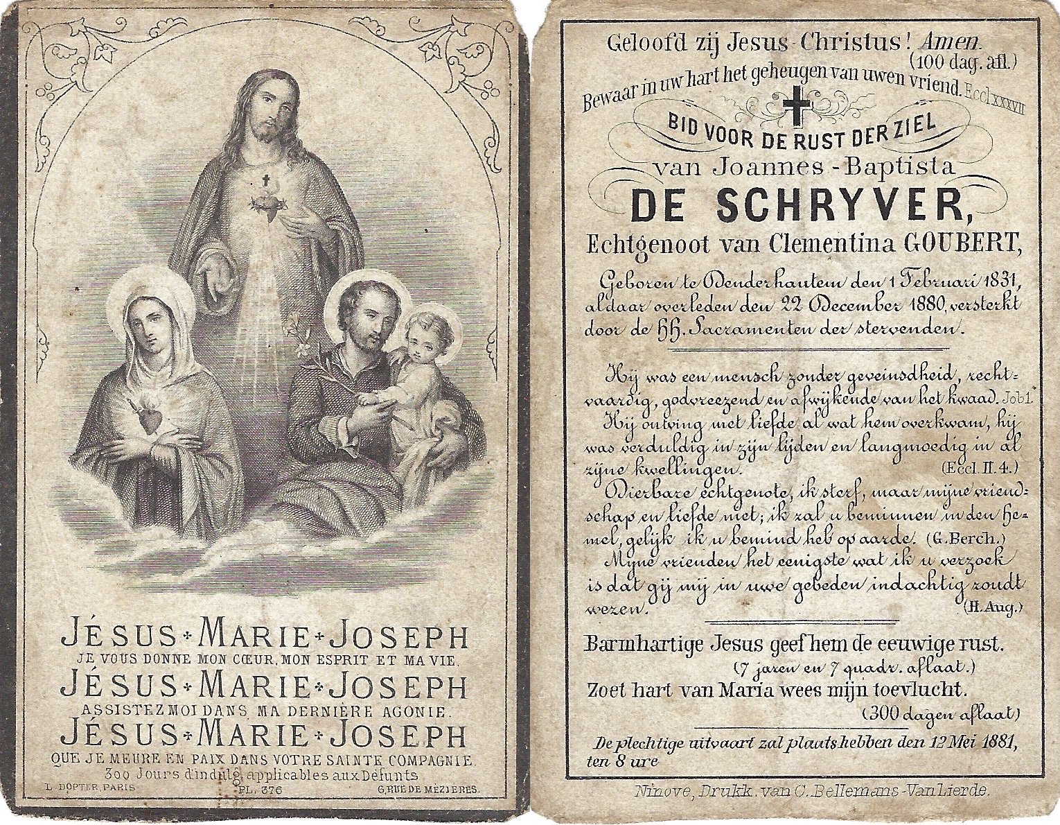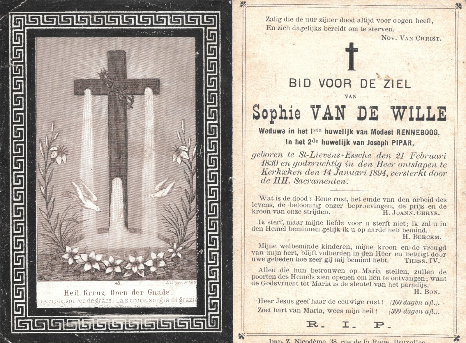 | Van De Wille Sophie | Renneboog Modest en Pipar Joseph | Sint-Lievens-Essche | 21/02/1830 | Kerksken | 14/01/1894 |
