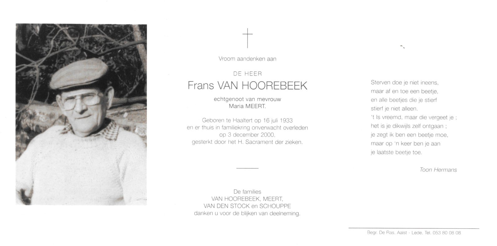 | Van Hoorebeek Frans | Meert Maria | Haaltert | 16/07/1933 | Haaltert | 03/12/2000 |