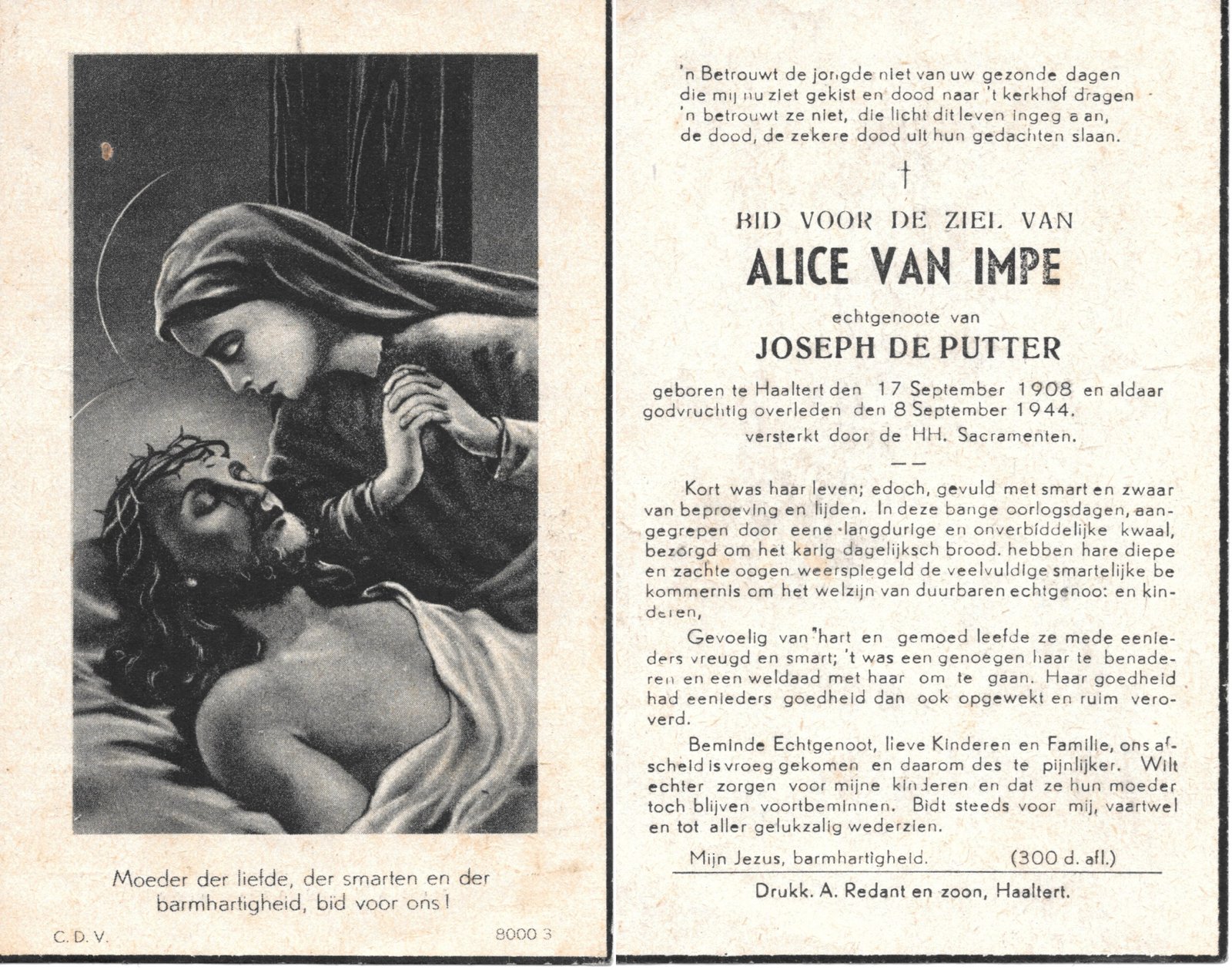 | Van Impe Alice | De Putter Joseph | Haaltert | 17/09/1908 | Haaltert | 08/09/1944 |