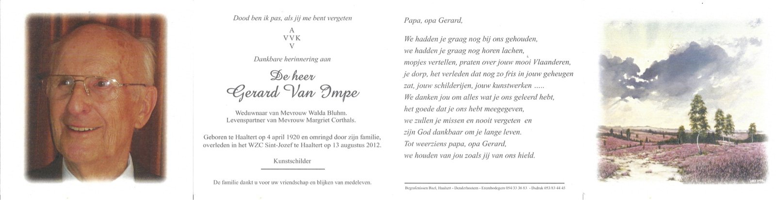 | Van Impe Gerard | Walda Bluhm en Margriet Corthals | Haaltert | 04/04/1920 | Haaltert | 13/08/2012 |