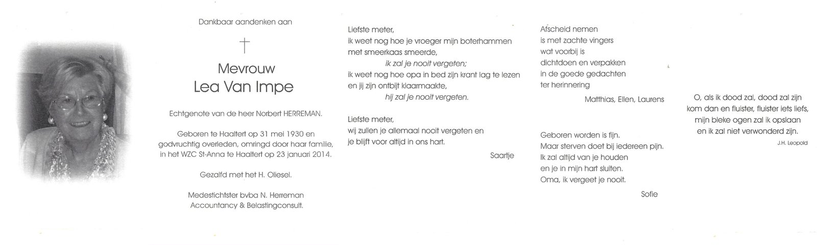 | Van Impe Lea | Herreman Norbert | Haaltert | 31/05/1930 | Haaltert | 23/01/2014 |