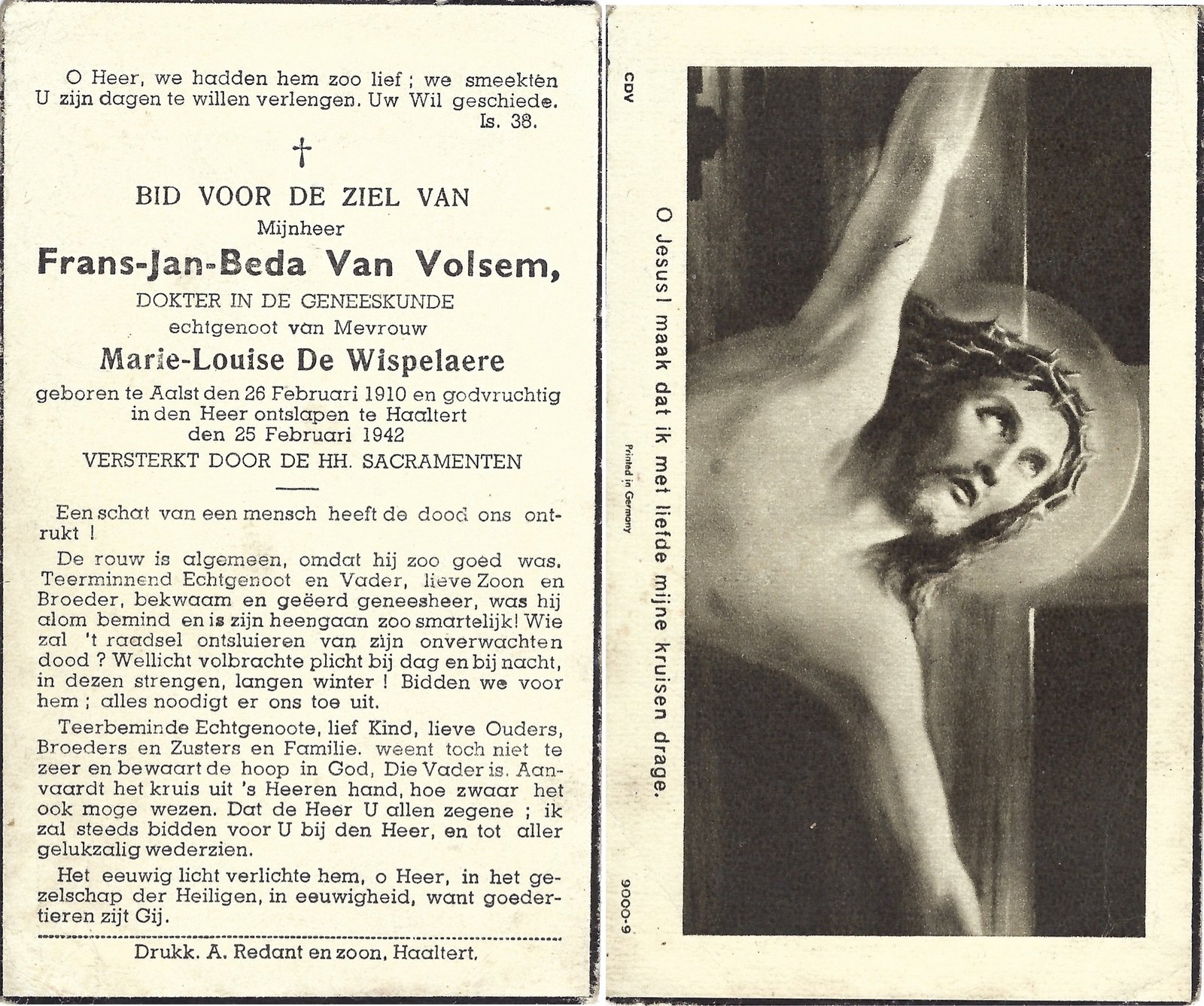 | Van Volsem Frans-Jan-Beda | De Wispelaere Marie-Louise | Aalst | 26/02/1910 | Haaltert | 25/02/1942 |