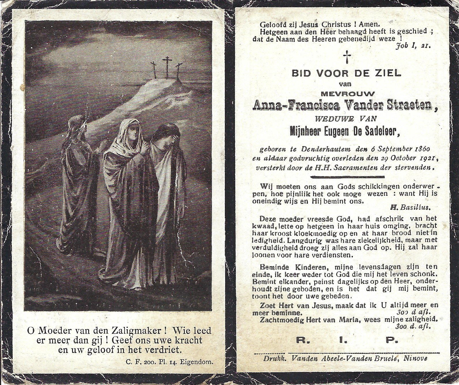 | Vander Straeten Anna-Francisca | De Sadeleer Eugeen | Denderhoutem | 06/09/1860 | Denderhoutem | 29/10/1921 |