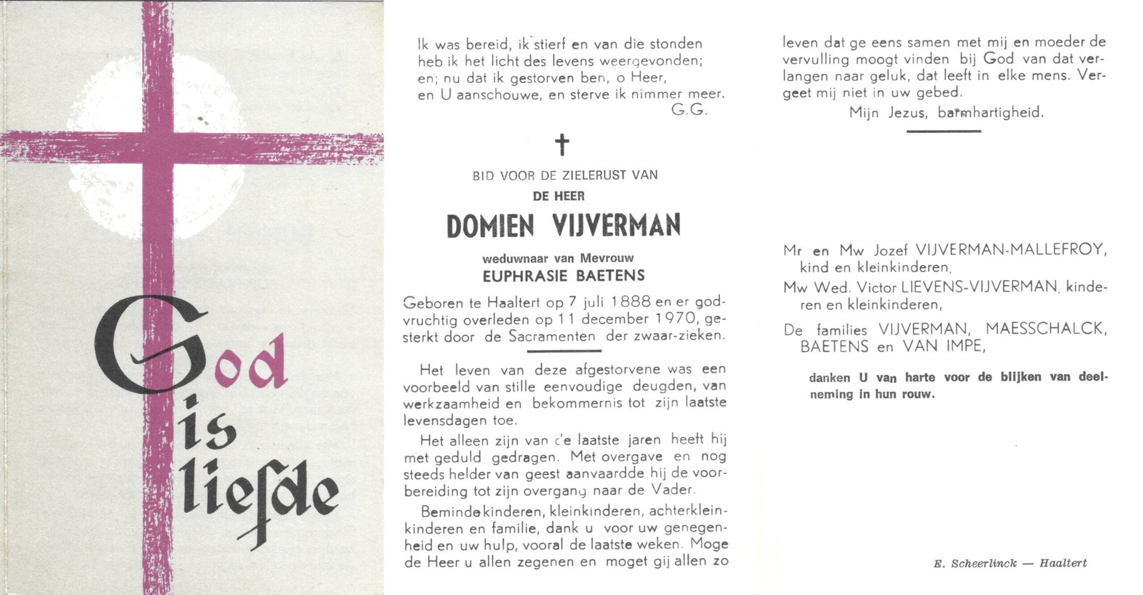| Vijverman Domien | Baetens Euphrasie | Haaltert | 07/07/1888 | Haaltert | 11/12/1970 |