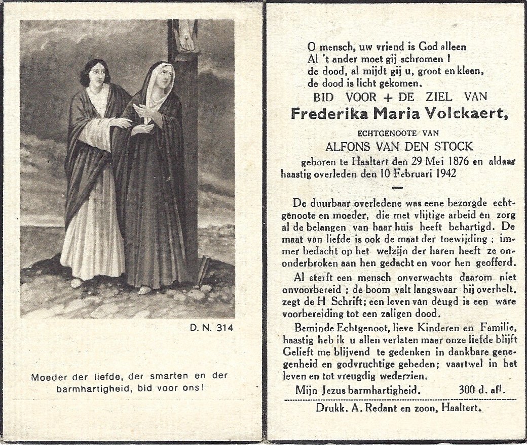 | Volckaert Frederika Maria | Van Den Stock Alfons | Haaltert | 29/05/1876 | Haaltert | 10/02/1942 |