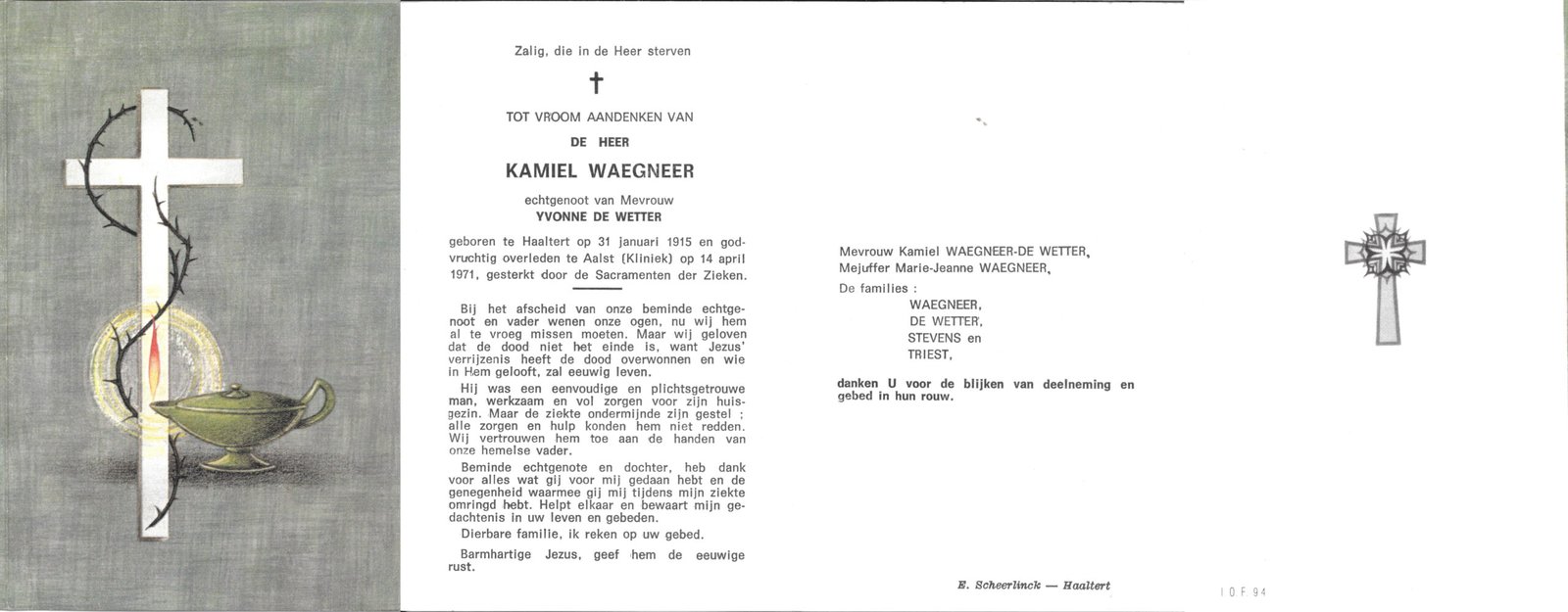| Waegneer Kamiel | De Wetter Yvonne | Haaltert | 31/01/1915 | Aalst | 14/04/1971 |