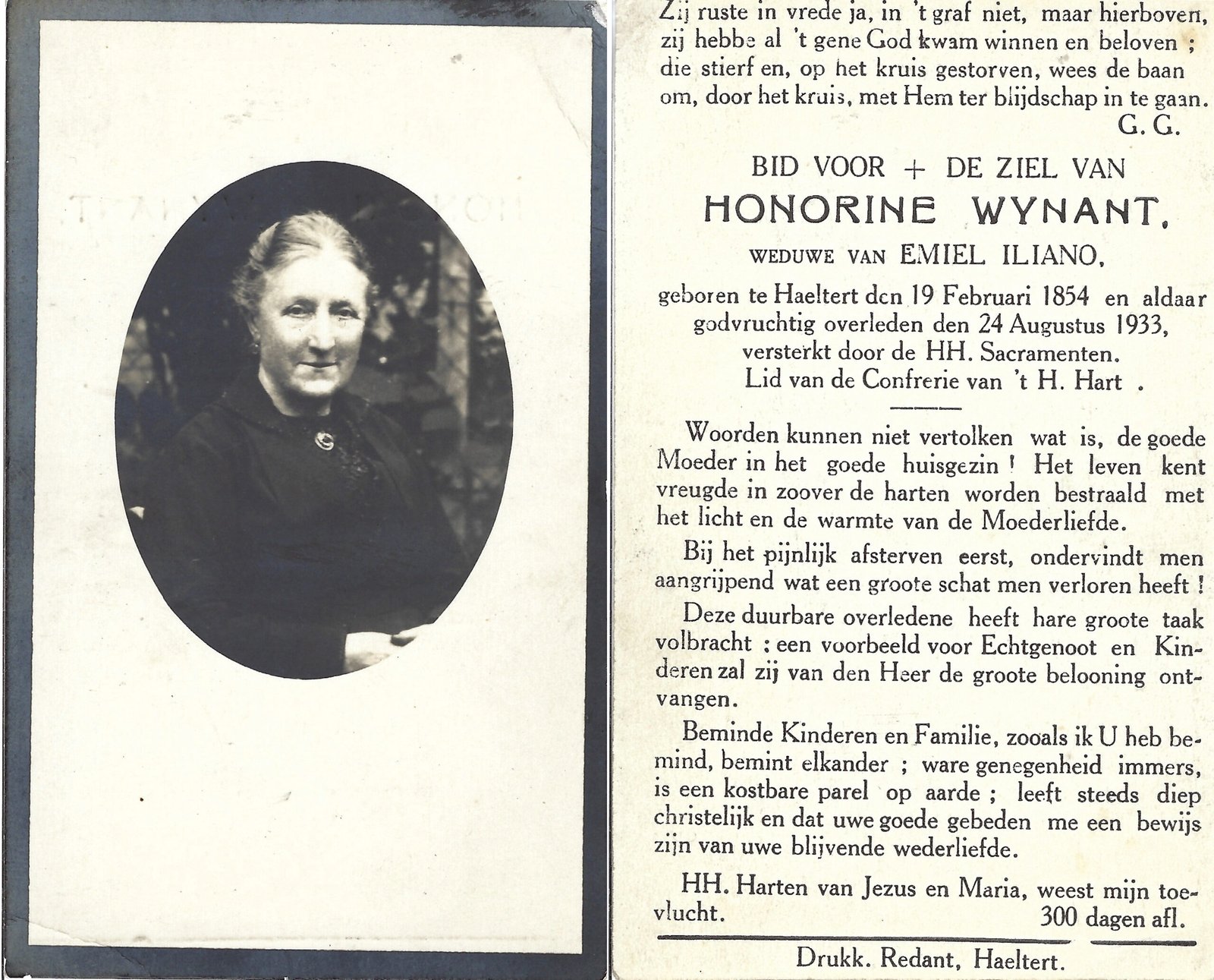 | Wynant Honorine | Iliano Emiel | Haaltert | 19/02/1854 | Haaltert | 24/08/1933 |