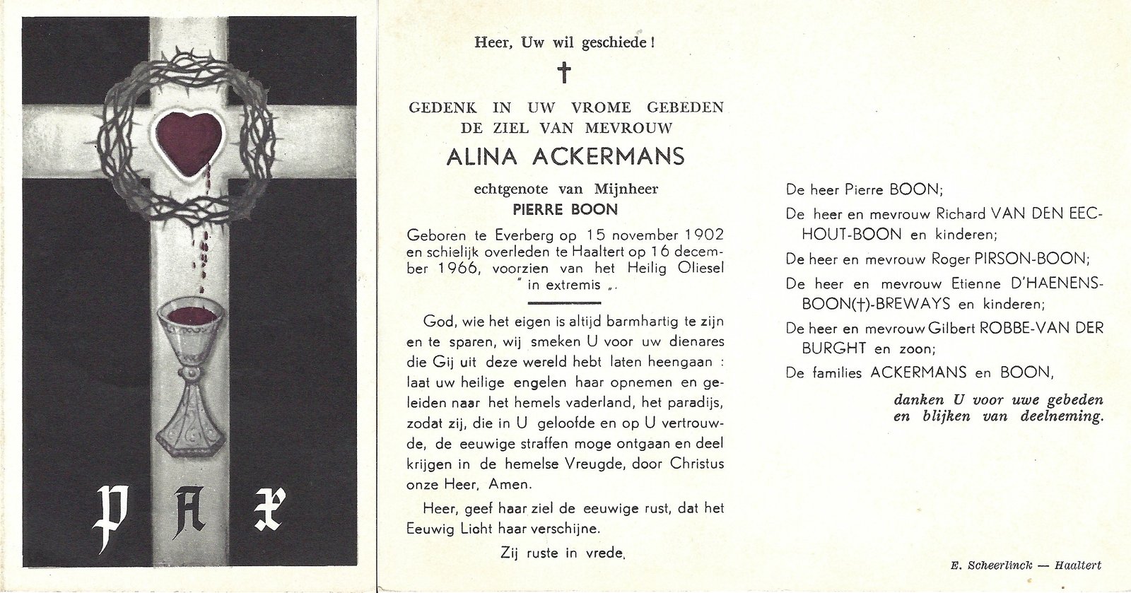 | Ackerman Alina | Boone Pierre | Everberg | 15/11/1902 | Haaltert | 16/12/1966 |