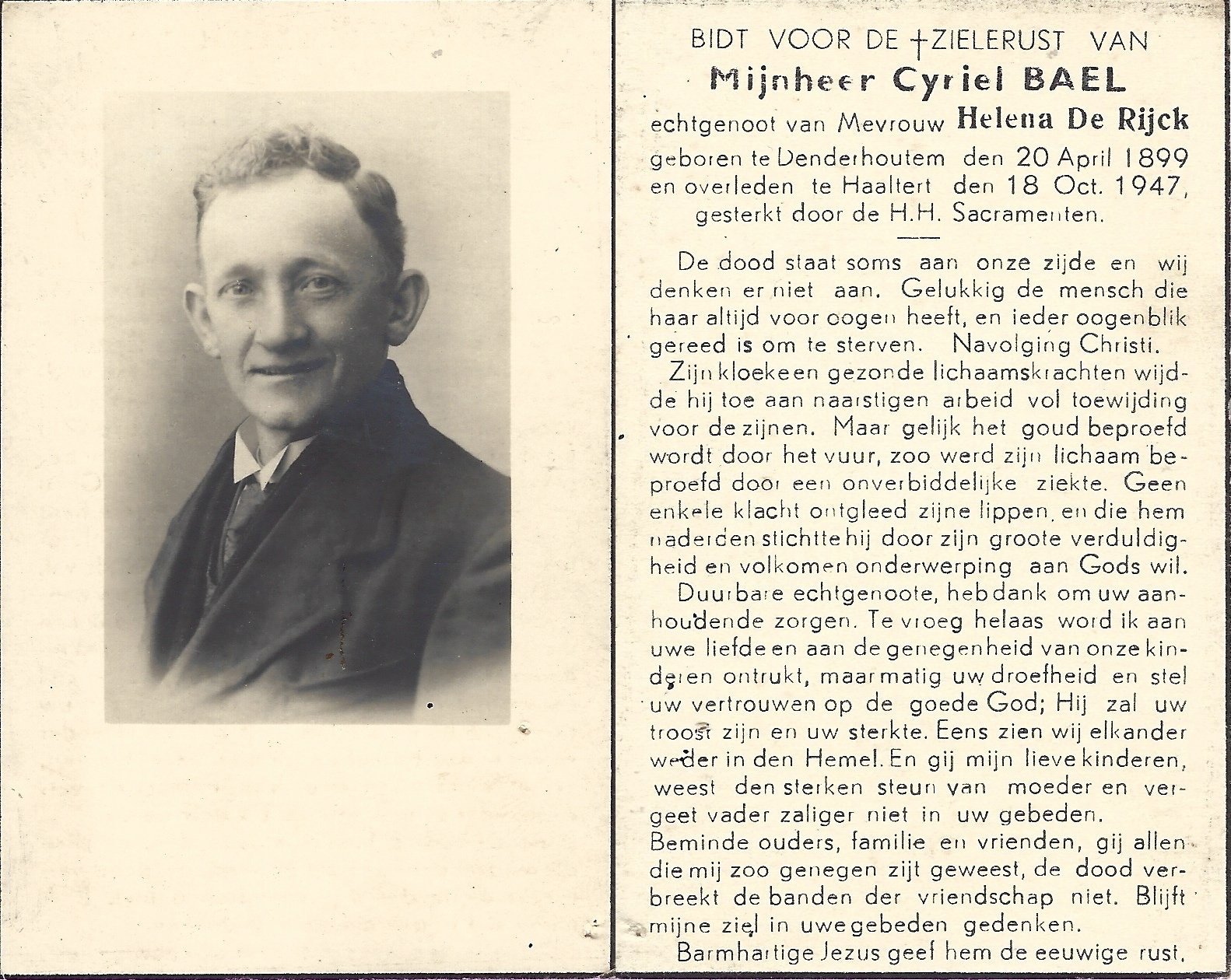 | Bael Cyriel | De Rijck Helena | Denderhoutem | 20/04/1899 | Haaltert | 18/10/1947 |