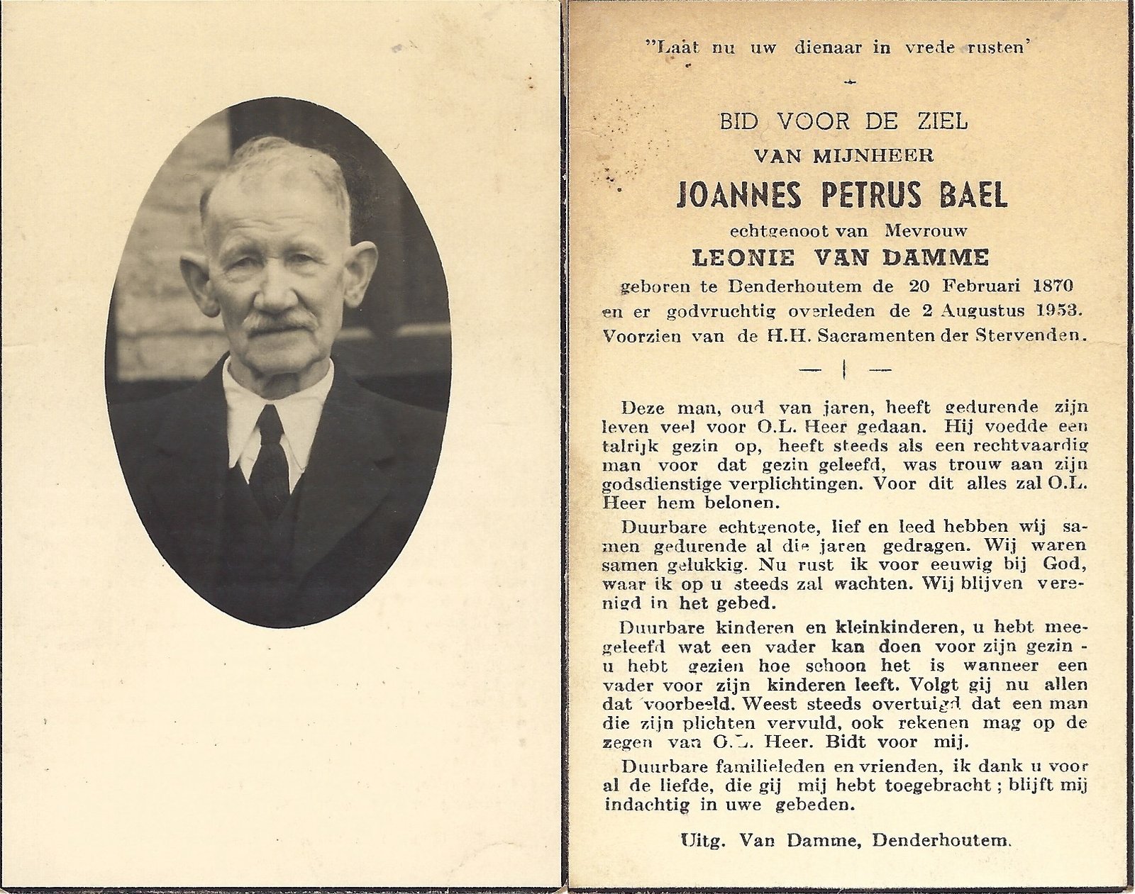 | Bael Joannes Petrus | Van Damme Leonie | Denderhoutem | 20/02/1870 | Denderhoutem | 02/08/1953 |