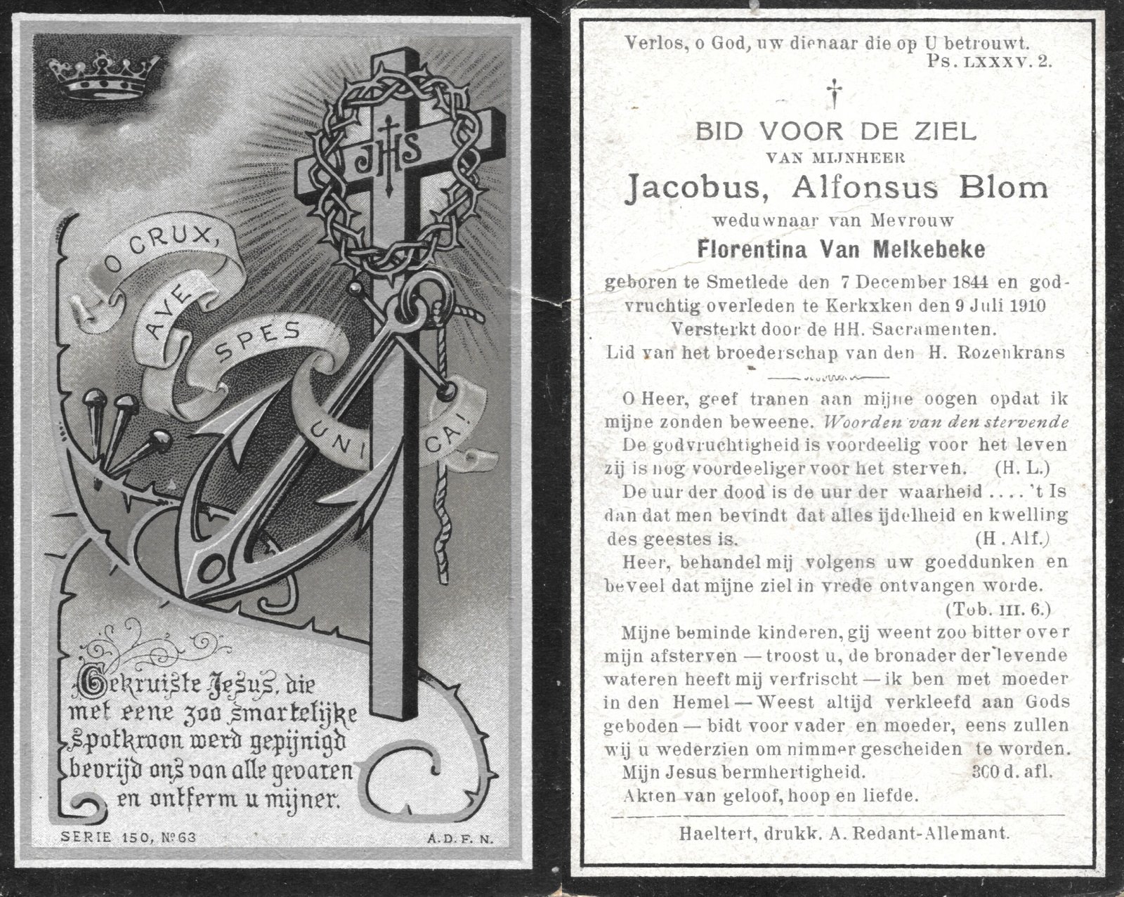 | Blom Jacobus Alfonsus | Van Melkebeke Florentina | Smetlede | 07/12/1844 | Kerksken | 09/07/1910 |