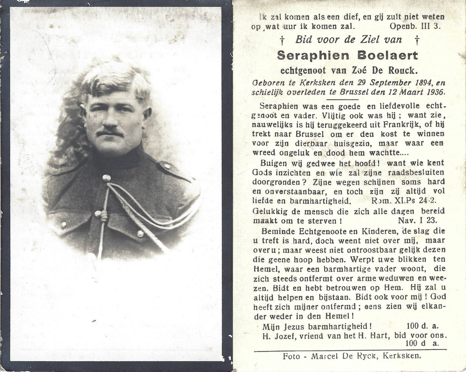 | Boelaert Seraphien | De Rouck Zoé | Kerksken | 29/09/1894 | Brussel | 12/03/1936 |