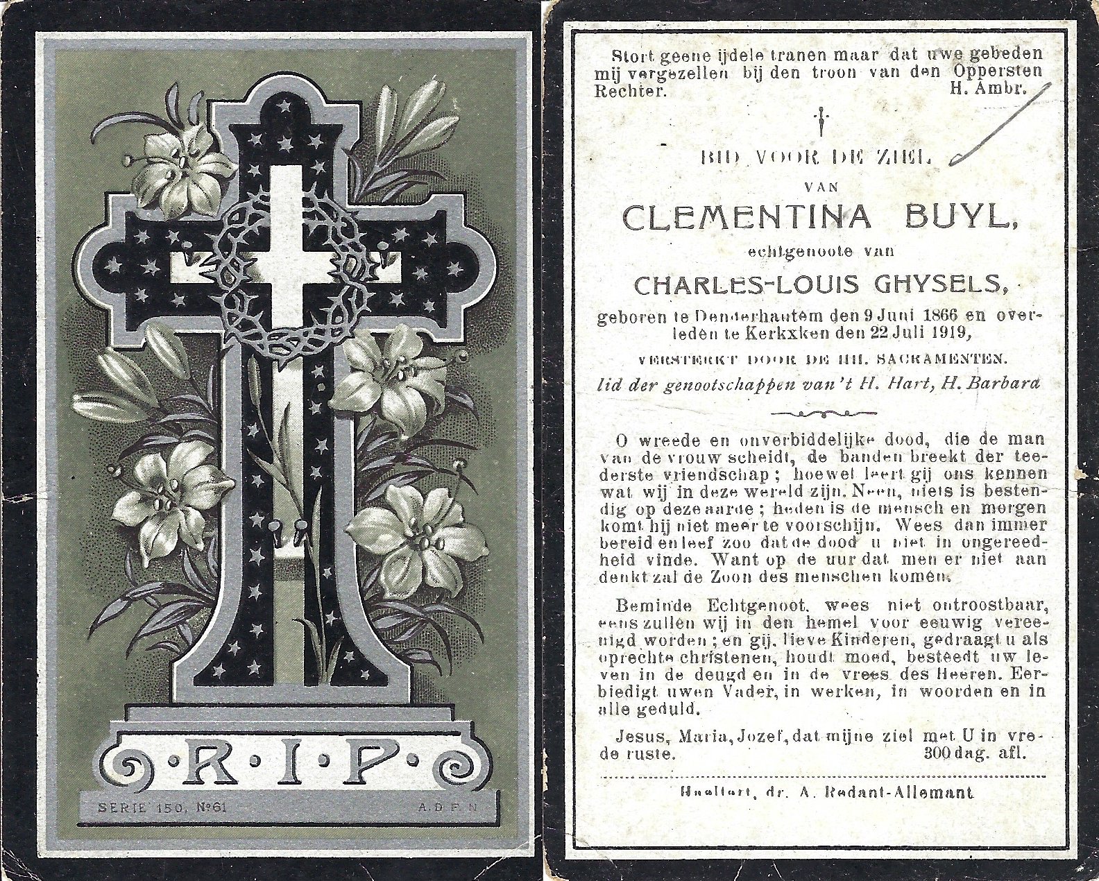| Buyl Clementina | Ghysels Charles-Louis | Denderhoutem | 09/06/1866 | Kerksken | 22/07/1919 |