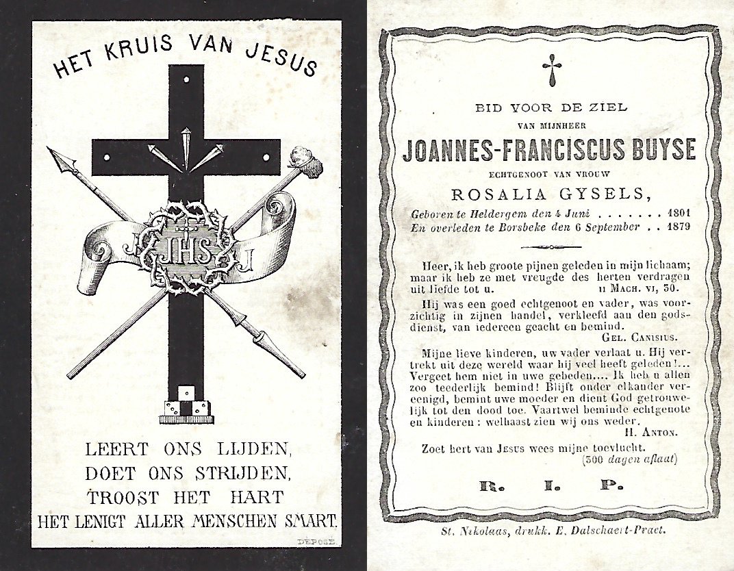 | Buyse Joannes Franciscus | Gysels Rosalia | Heldergem | 04/06/1801 | Borsbeke | 06/09/1879 |