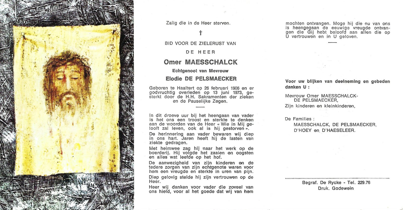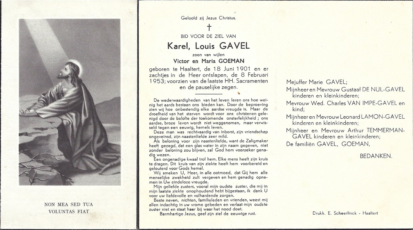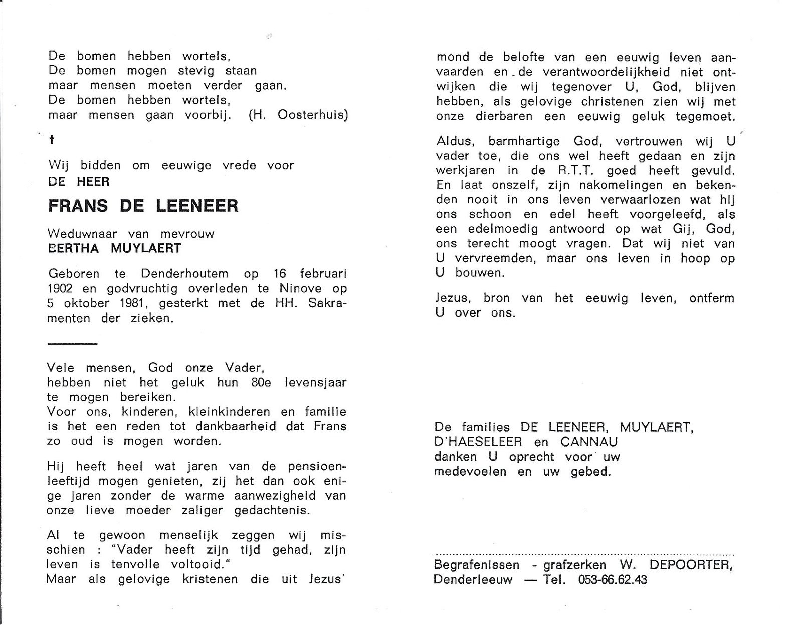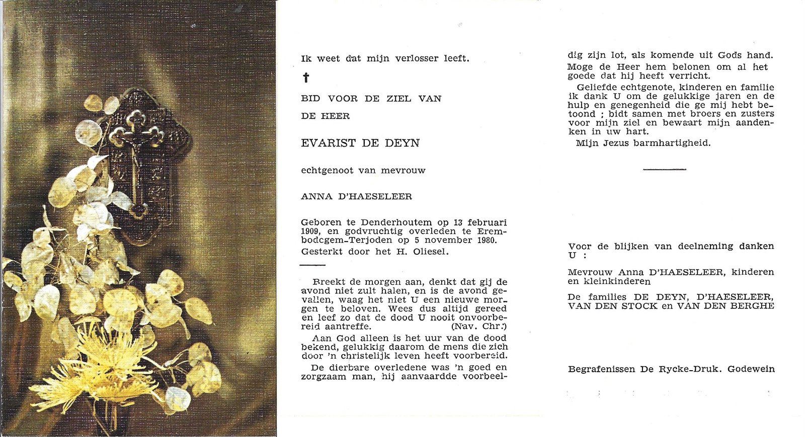 | De Deyn Evarist | D’Haeseleer Anna | Denderhoutem | 13/02/1909 | Terjoden | 05/11/1980 |