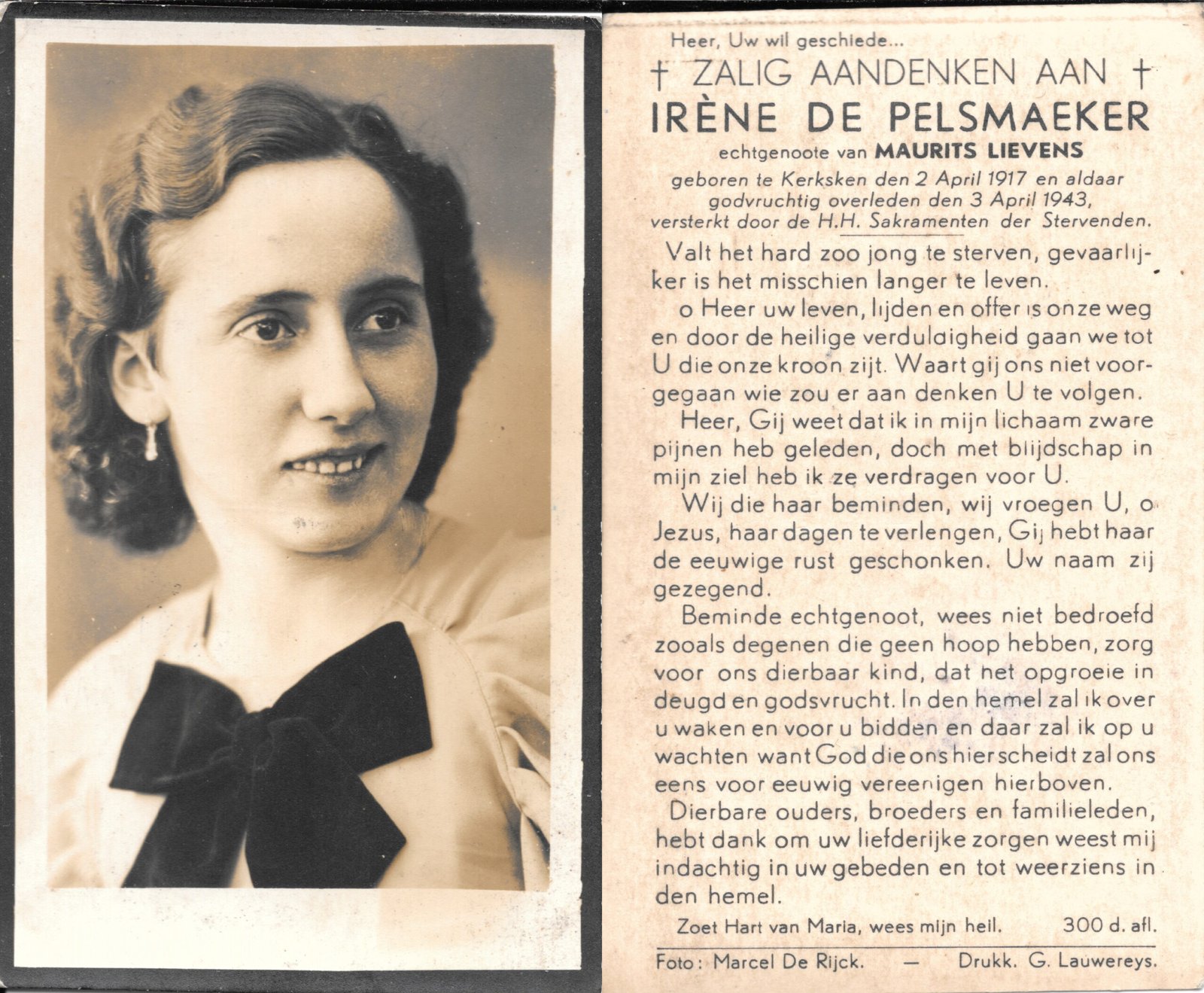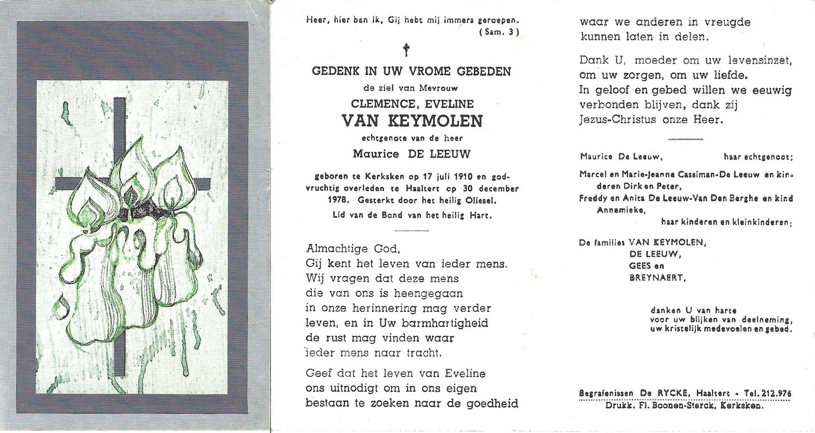 | Van Keymolen Clemence Eveline | De Leeuw Maurice | Kerksken | 17/07/1910 | Haaltert | 30/12/1978 |