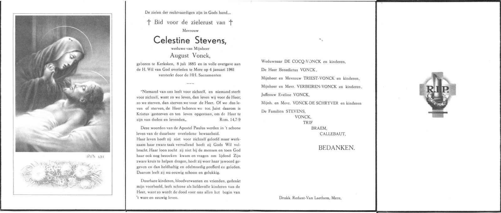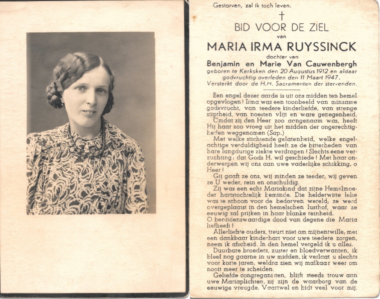 | Coppens Maria Cerina Irma Coppens | Redant Romain | Kerksken | 09/08/1882 | Kerksken | 17/12/1919 |