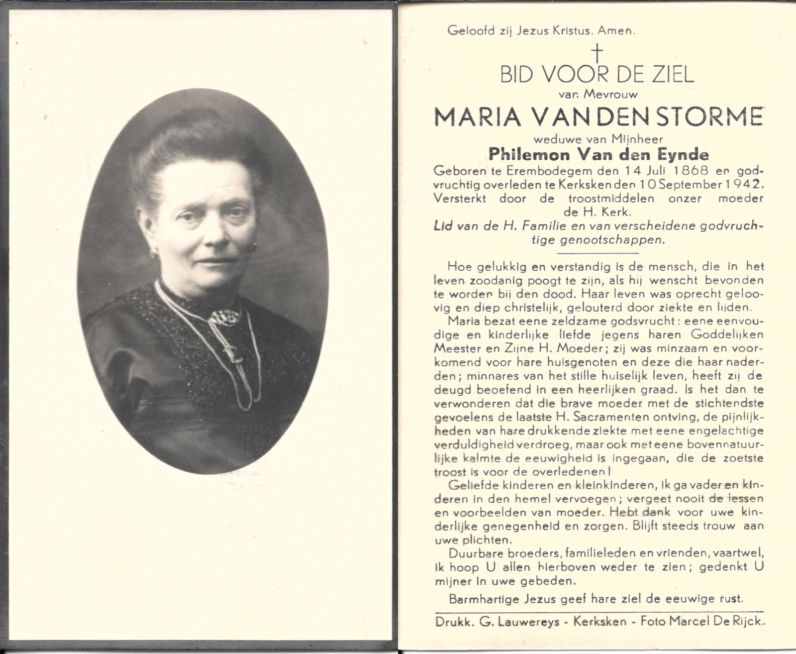 | Van Den Storme Maria | Van den Eynde Philemon | Erembodegem | 14/07/1868 | Kerksken | 10/09/1942 |