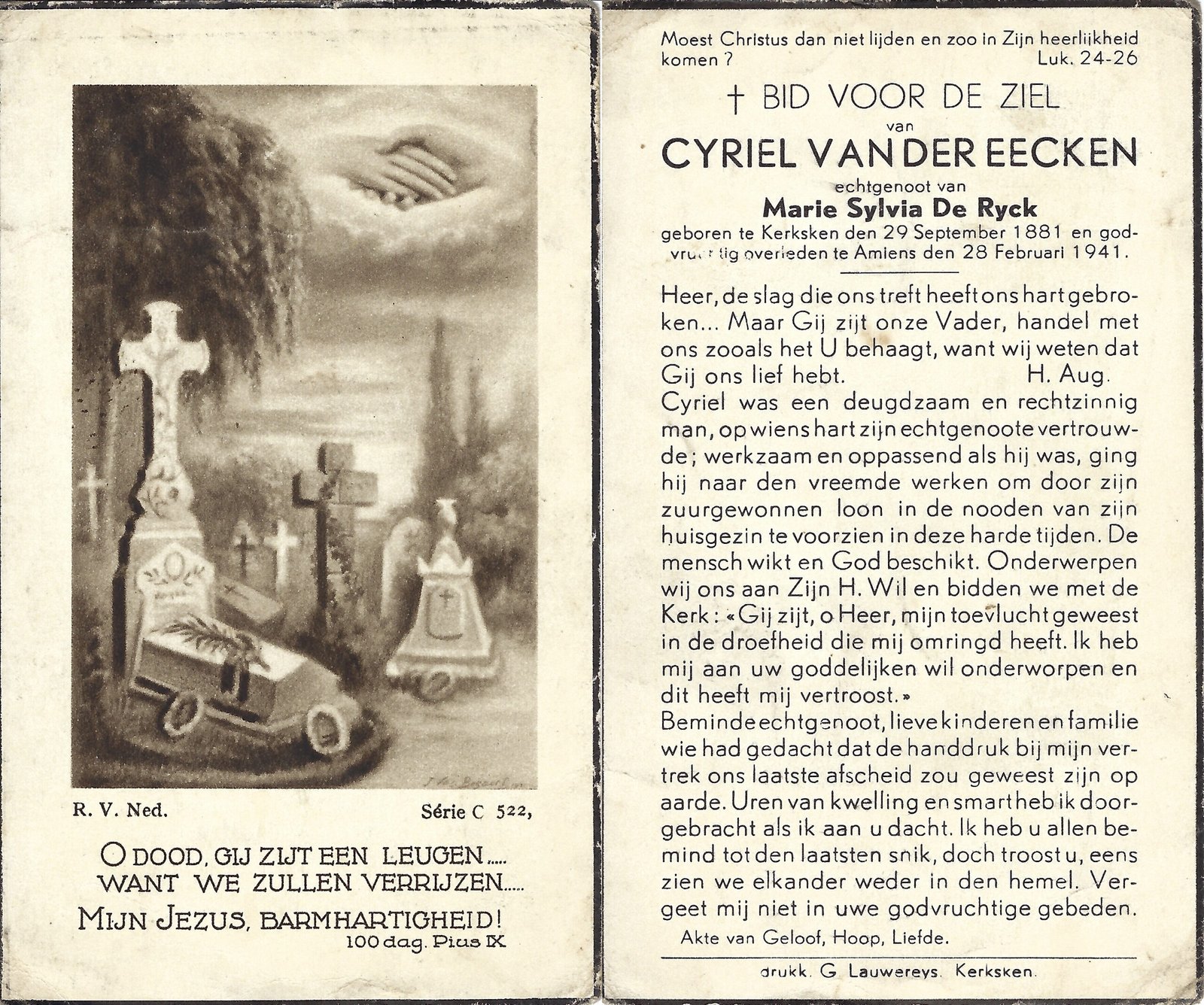 | Van der Eecken Cyriel | De Ryck Marie Sylvia | Kerksken | 29/09/1881 | Amiens | 28/02/1941 |