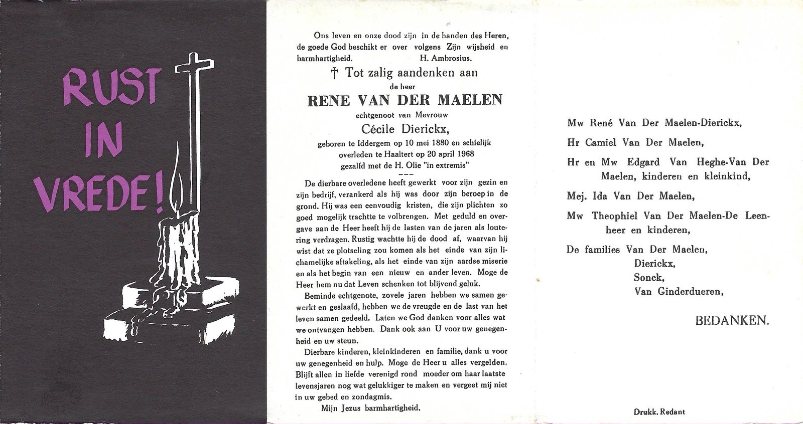 | Van Der Maelen René | Dierickx Cécile | Iddergem | 10/05/1880 | Haaltert | 20/04/1968 |