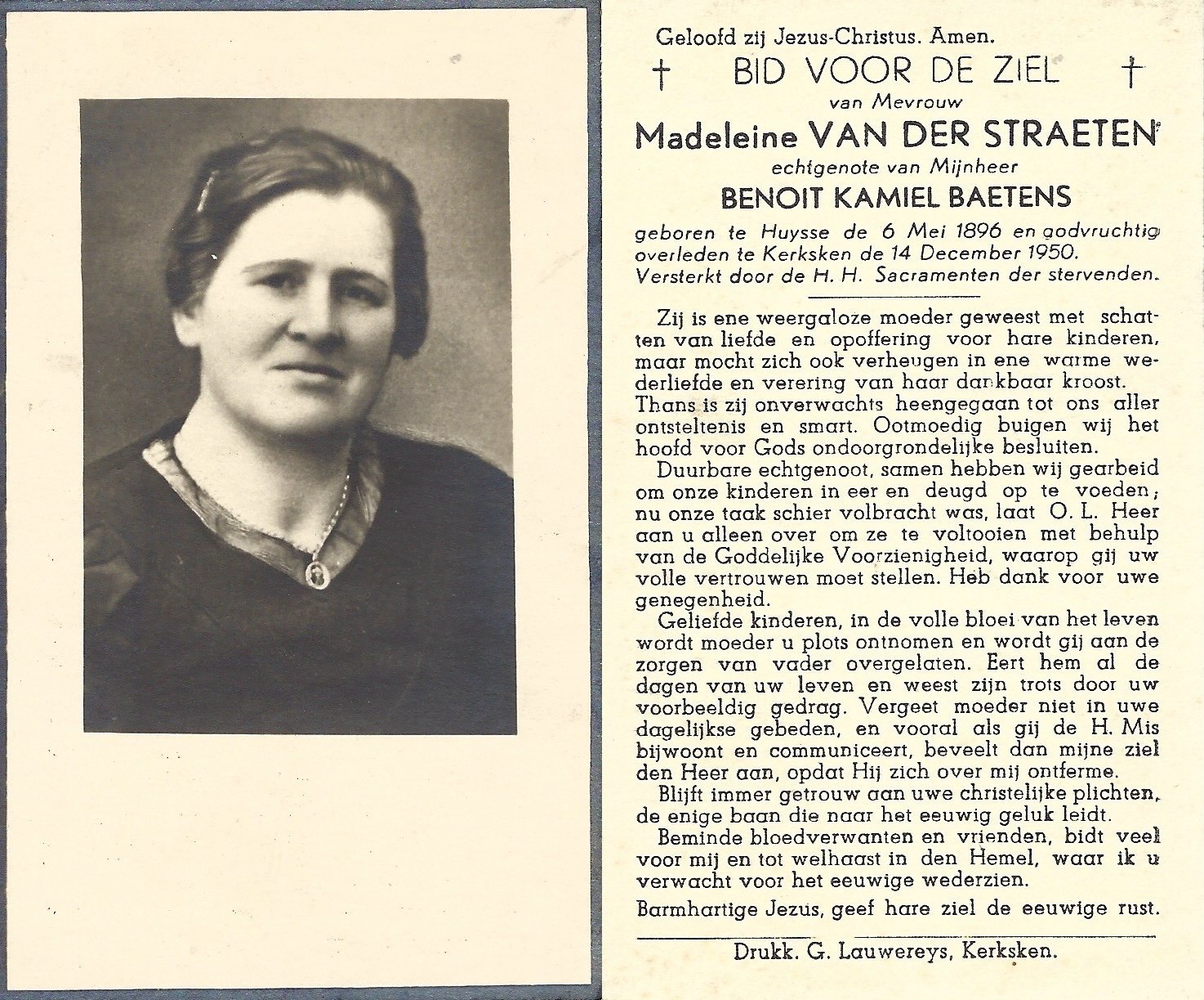| Van Der Straeten Madeleine | Baetens Benoit Kamiel | Huysse | 06/05/1896 | Kerksken | 14/12/1950 |