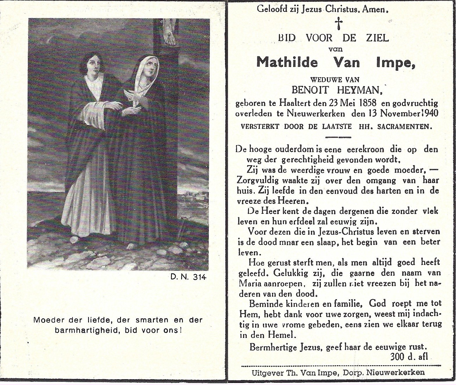 | Van Impe Mathilde | Heyman Benoit | Haaltert | 23/05/1858 | Nieuwerkerken | 13/11/1940 |