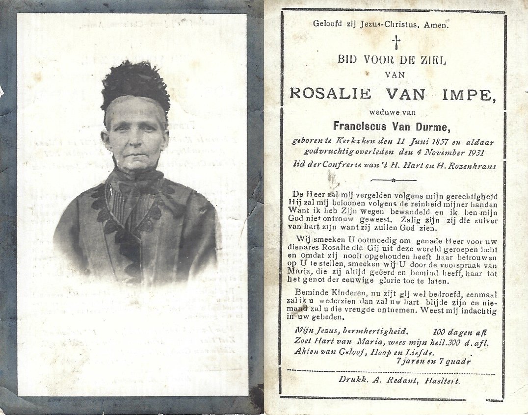 | Van Impe Rosalie | Van Durme Franciscus | Kerksken | 11/06/1857 | Kerksken | 04/11/1931 |